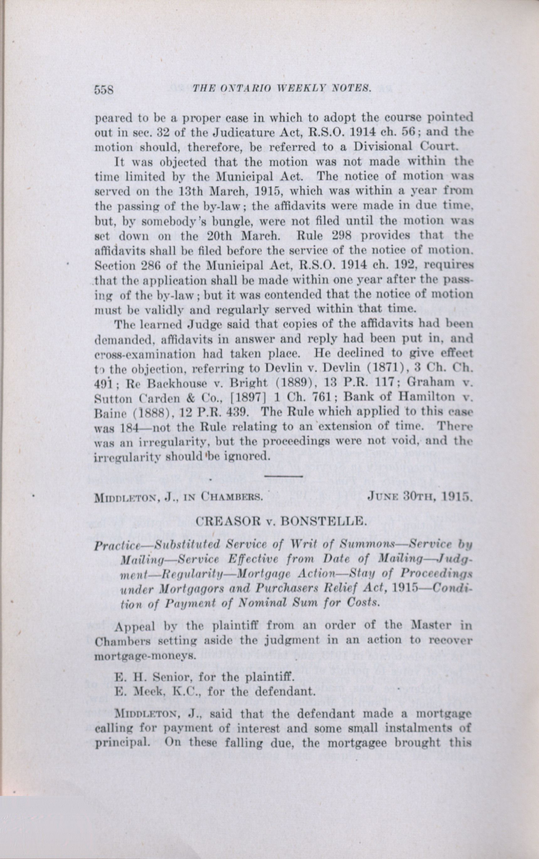 The Ontario Weekly Notes. : Vol. VIII. No. 17 (July 9, 1915.)