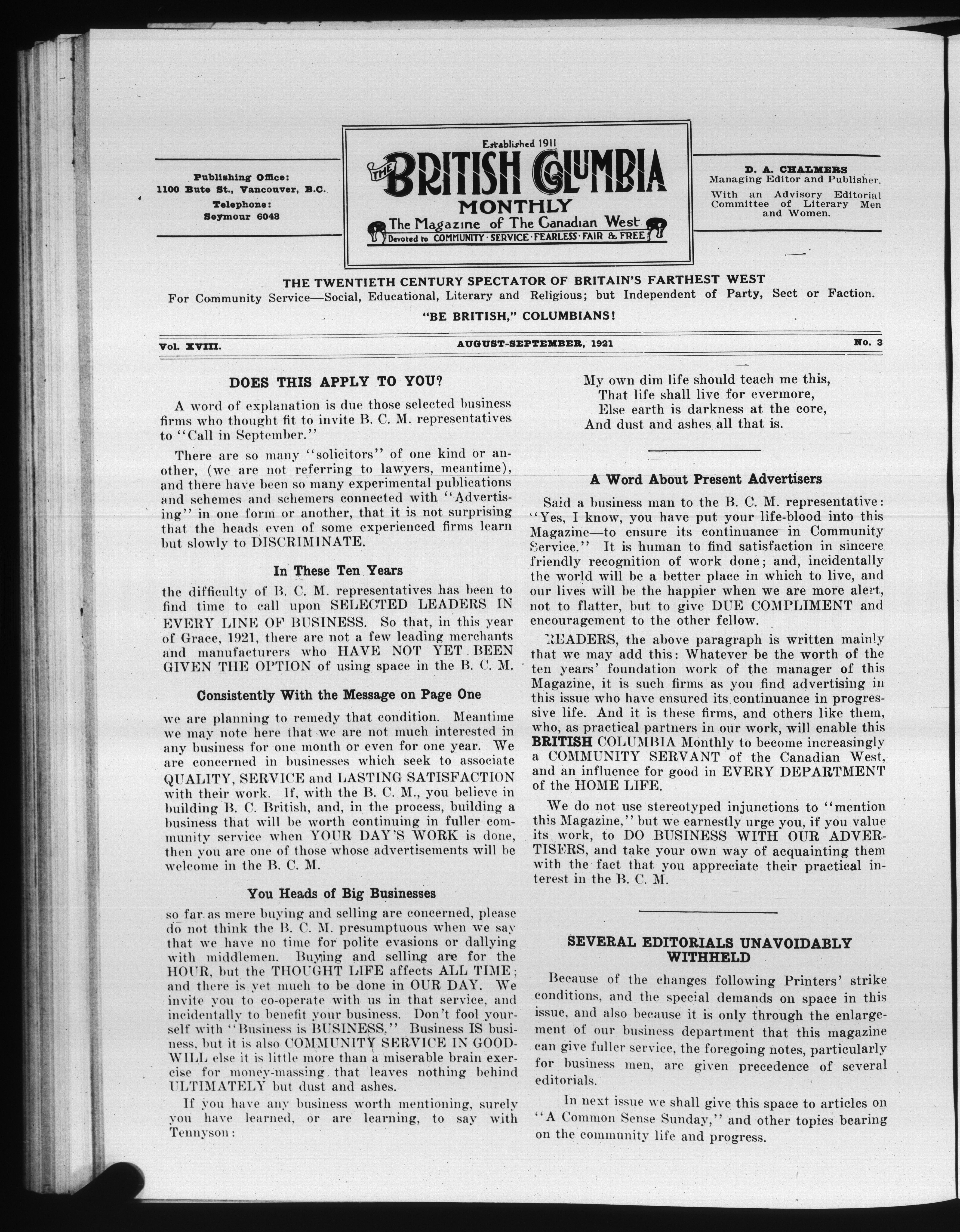 British Columbia monthly : Vol. XVIII, No. 3 (August-September 1921)