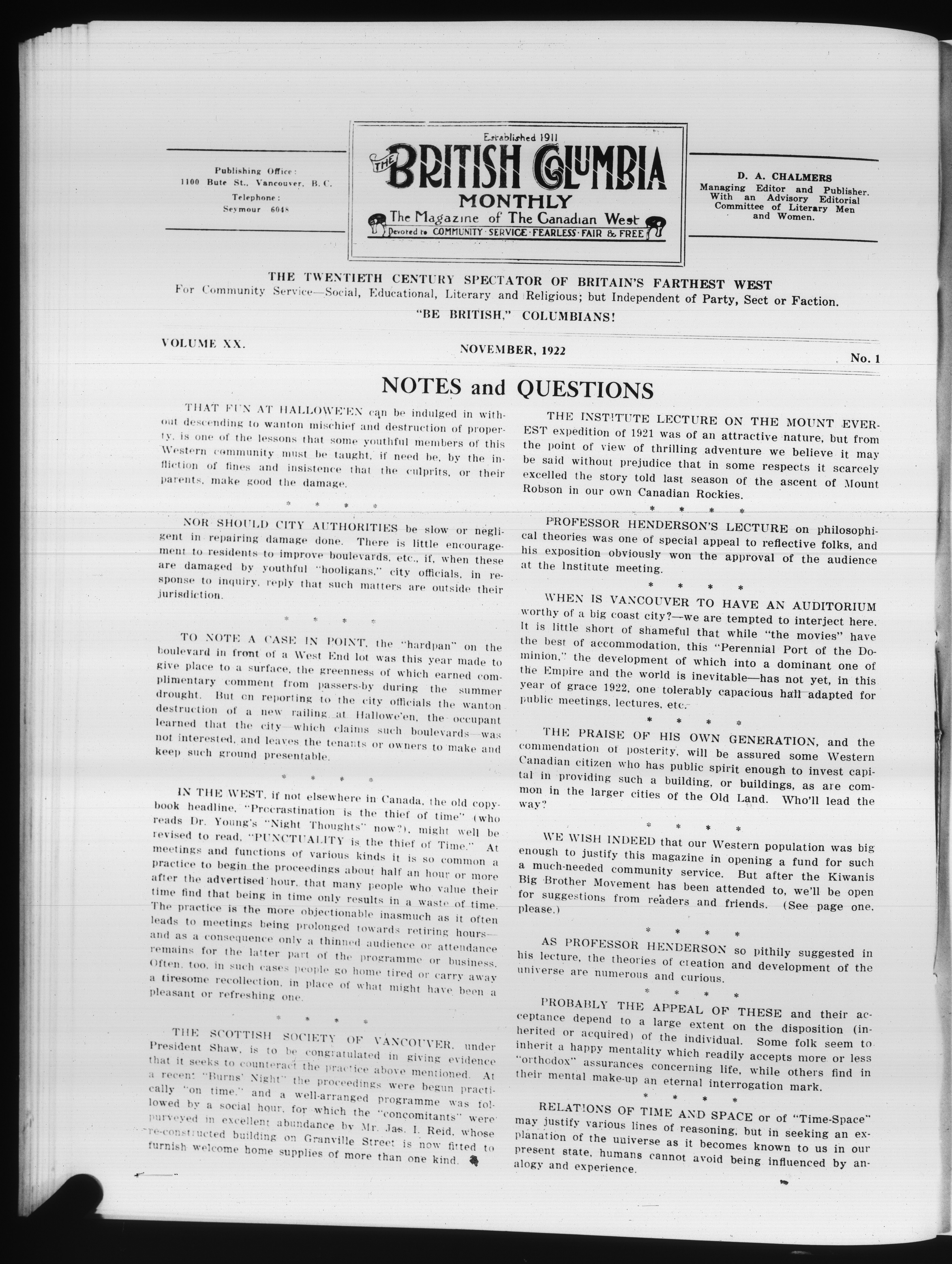 British Columbia monthly : Vol. XX, No. 1 (November 1922)