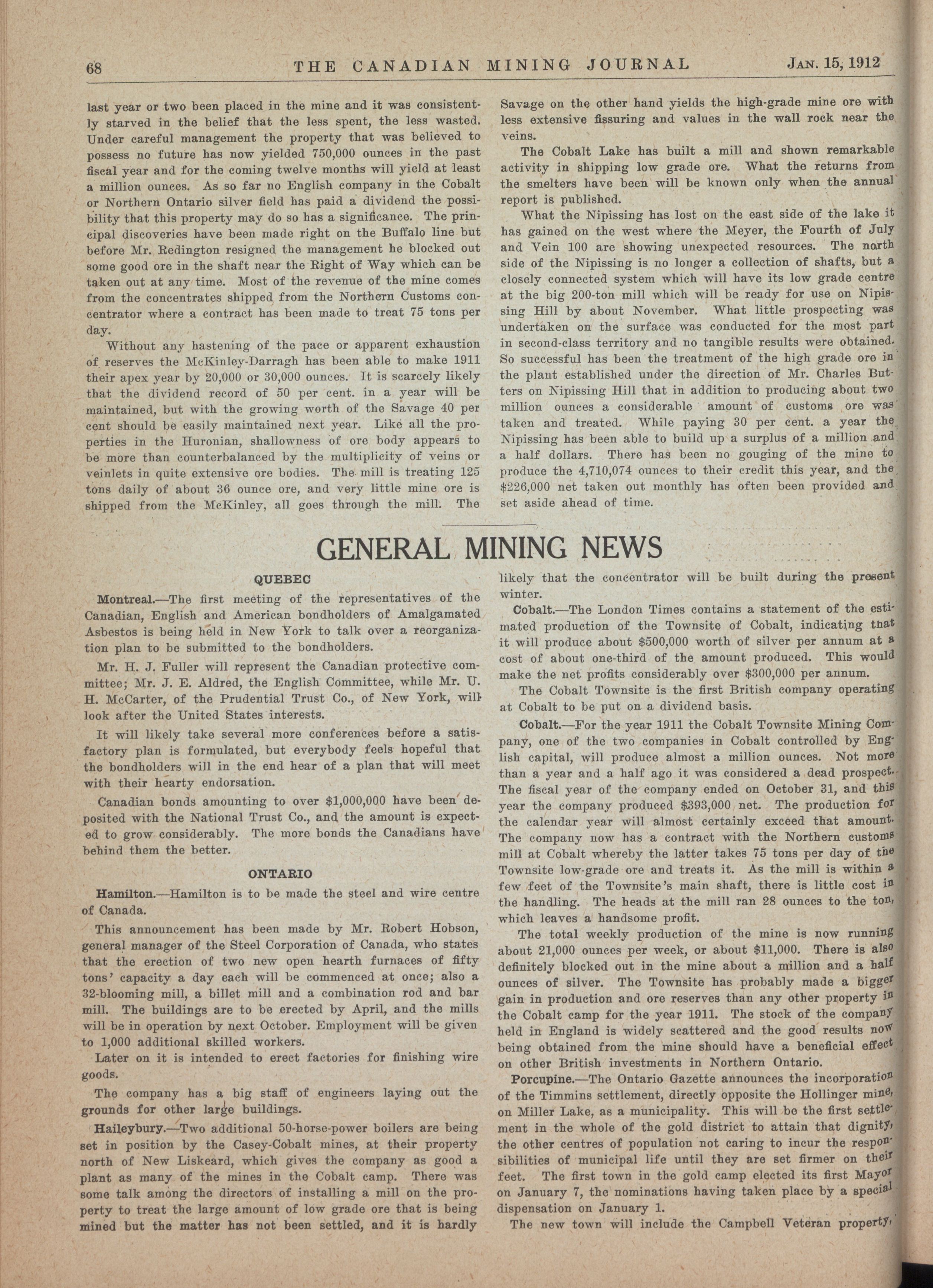 The Canadian Mining Journal : Vol. XXXIII, No. 2 (Jan. 15, 1912)