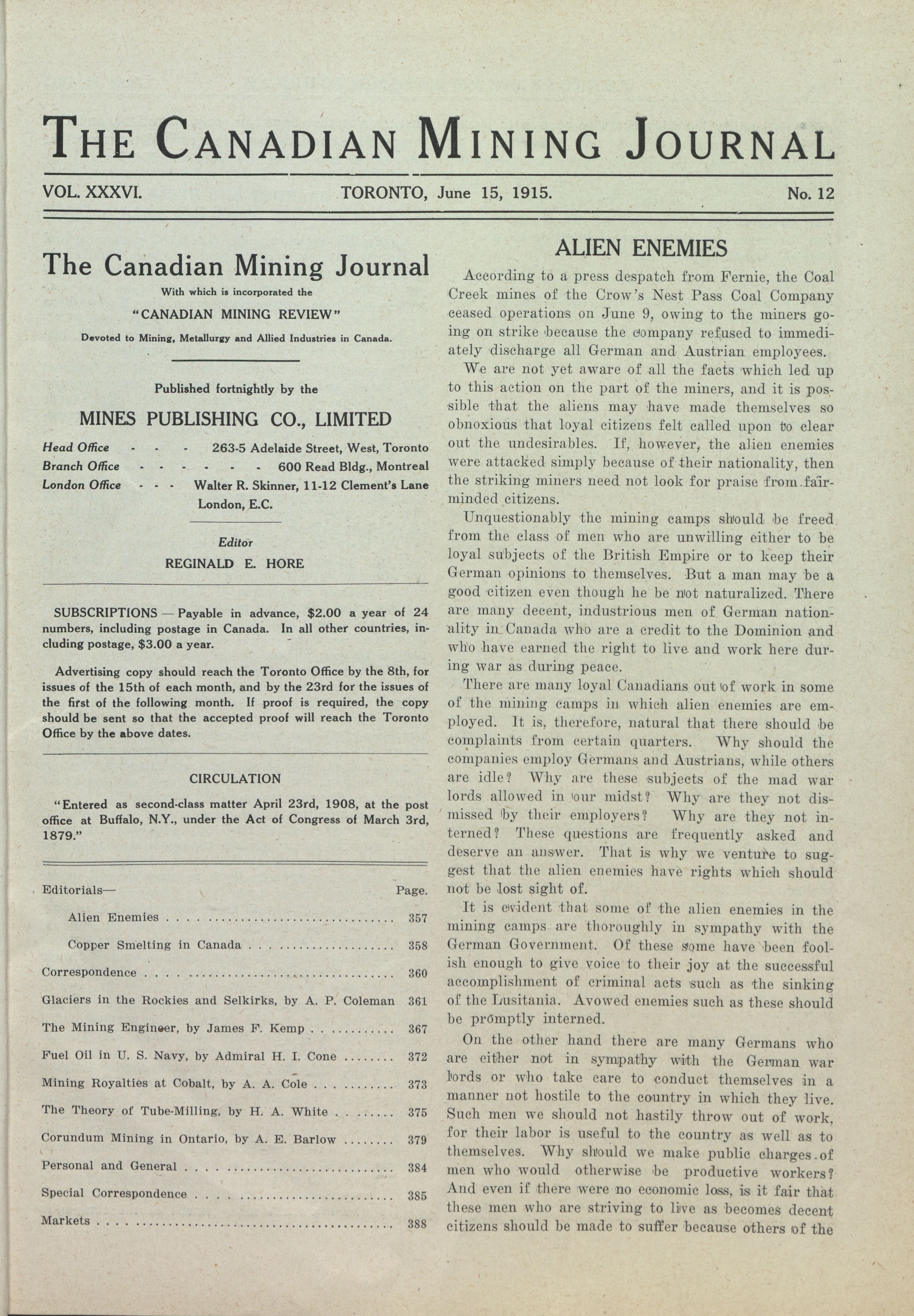 The Canadian Mining Journal : Vol. XXXVI, No. 12 (June 15, 1915)