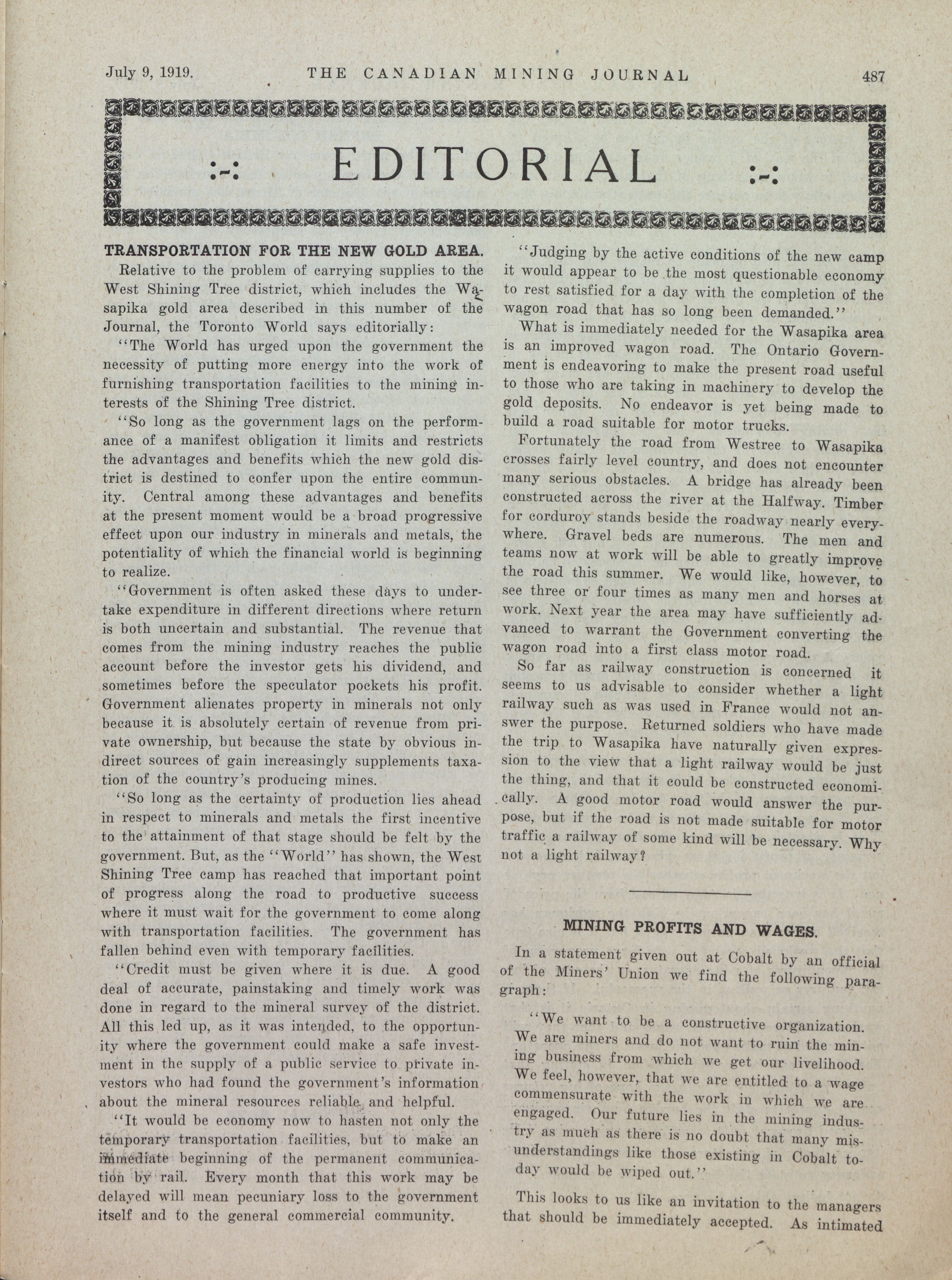 The Canadian Mining Journal : Vol. XL, No. 27 (July 9, 1919)