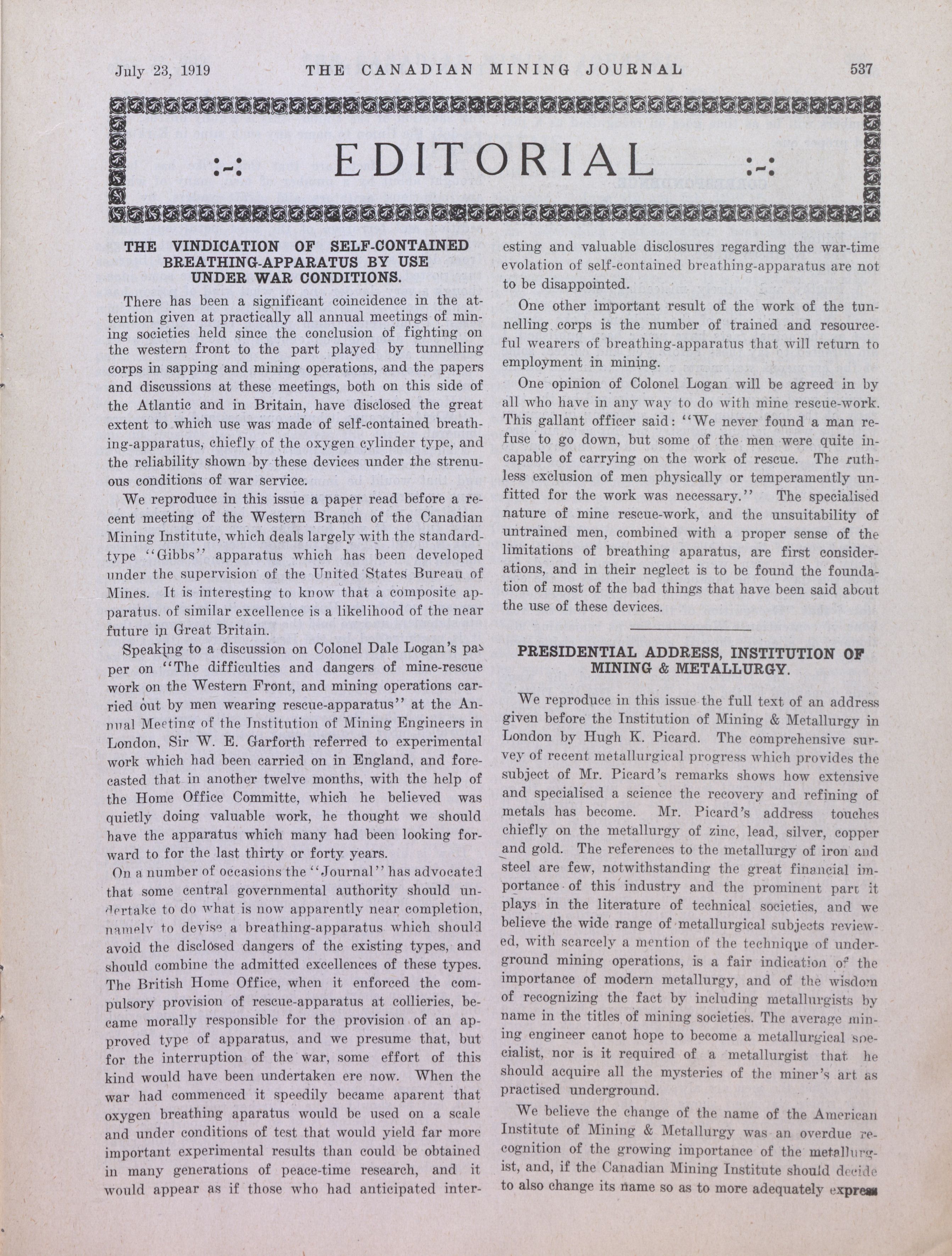 The Canadian Mining Journal : Vol. XL, No. 29 (July 23, 1919)