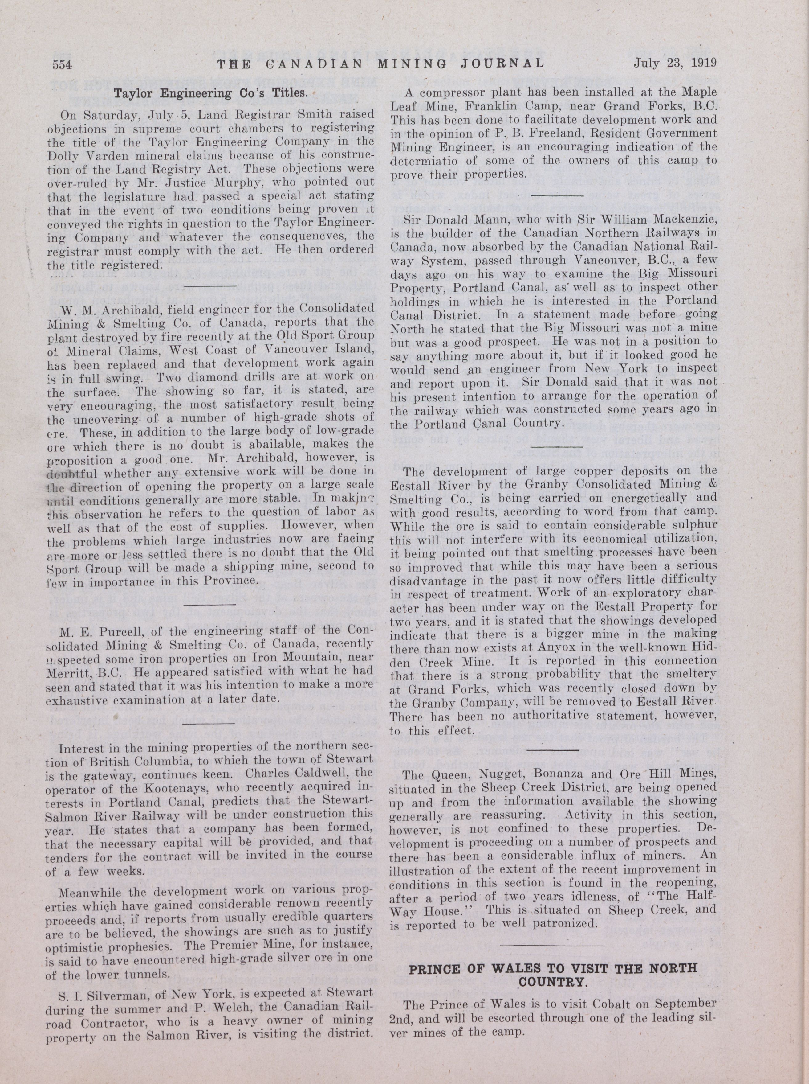 The Canadian Mining Journal : Vol. XL, No. 29 (July 23, 1919)