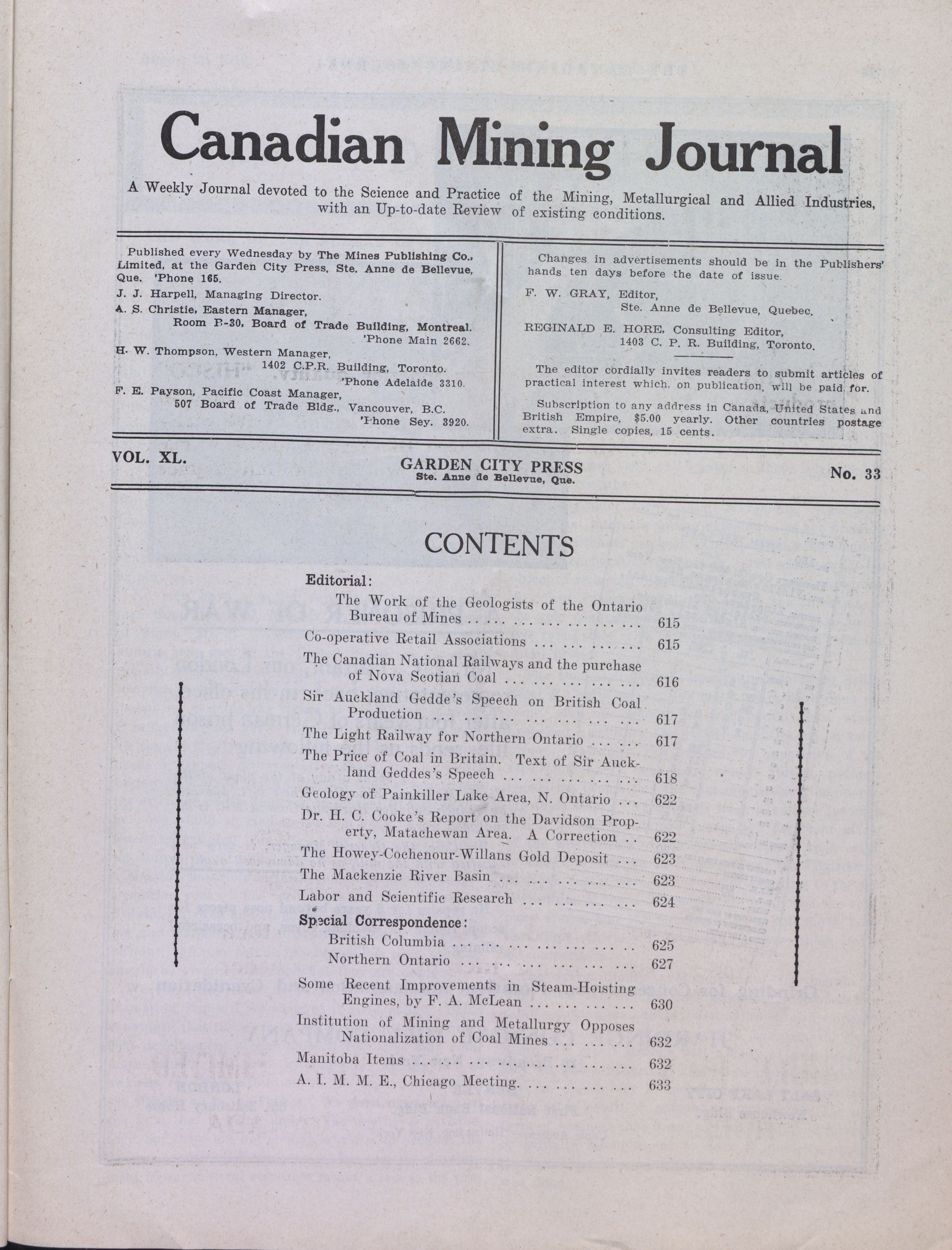 The Canadian Mining Journal : Vol. XL, No. 33 (August 20, 1919)