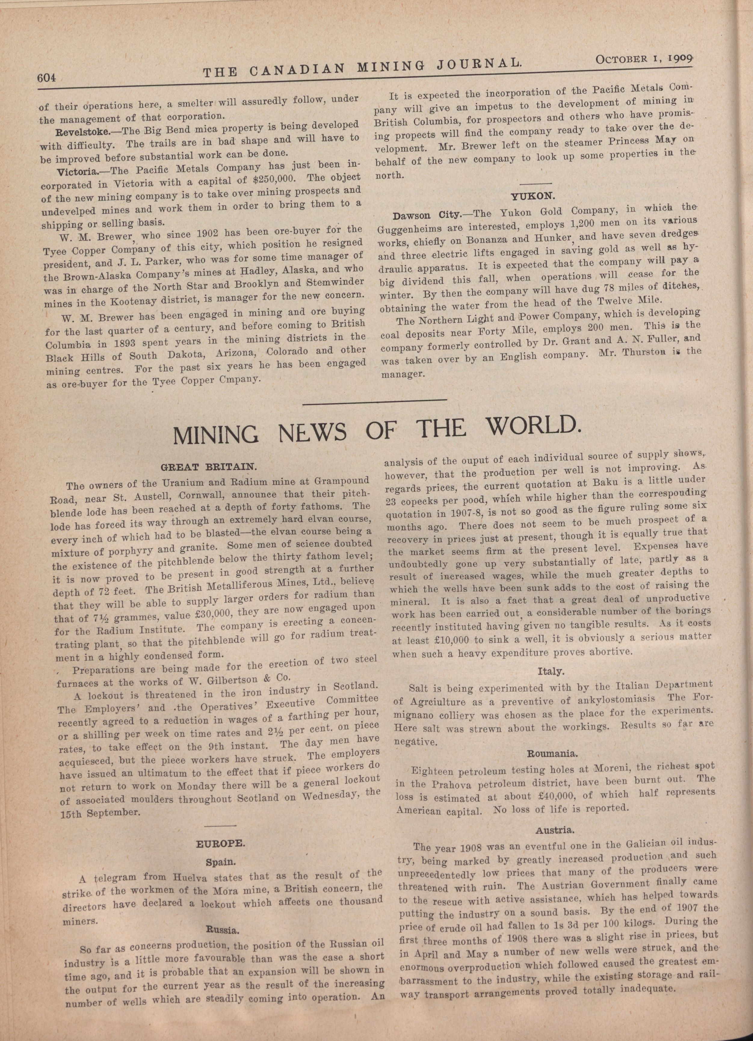 The Canadian Mining Journal : Vol. XXX, No. 19 (October 1, 1909)