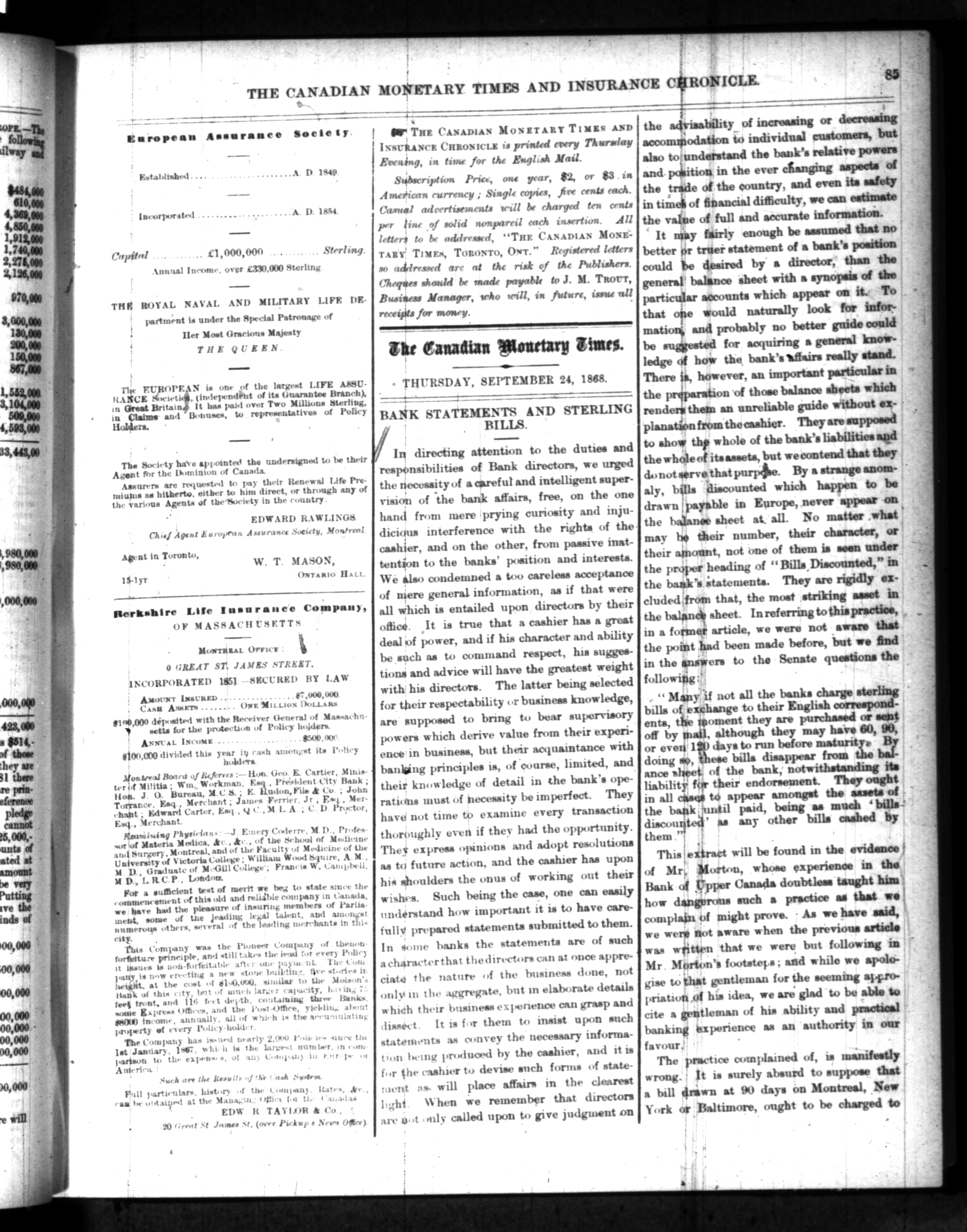 The Canadian Monetary Times and insurance chronicle : Vol. II, No. 6 (September 24, 1868)