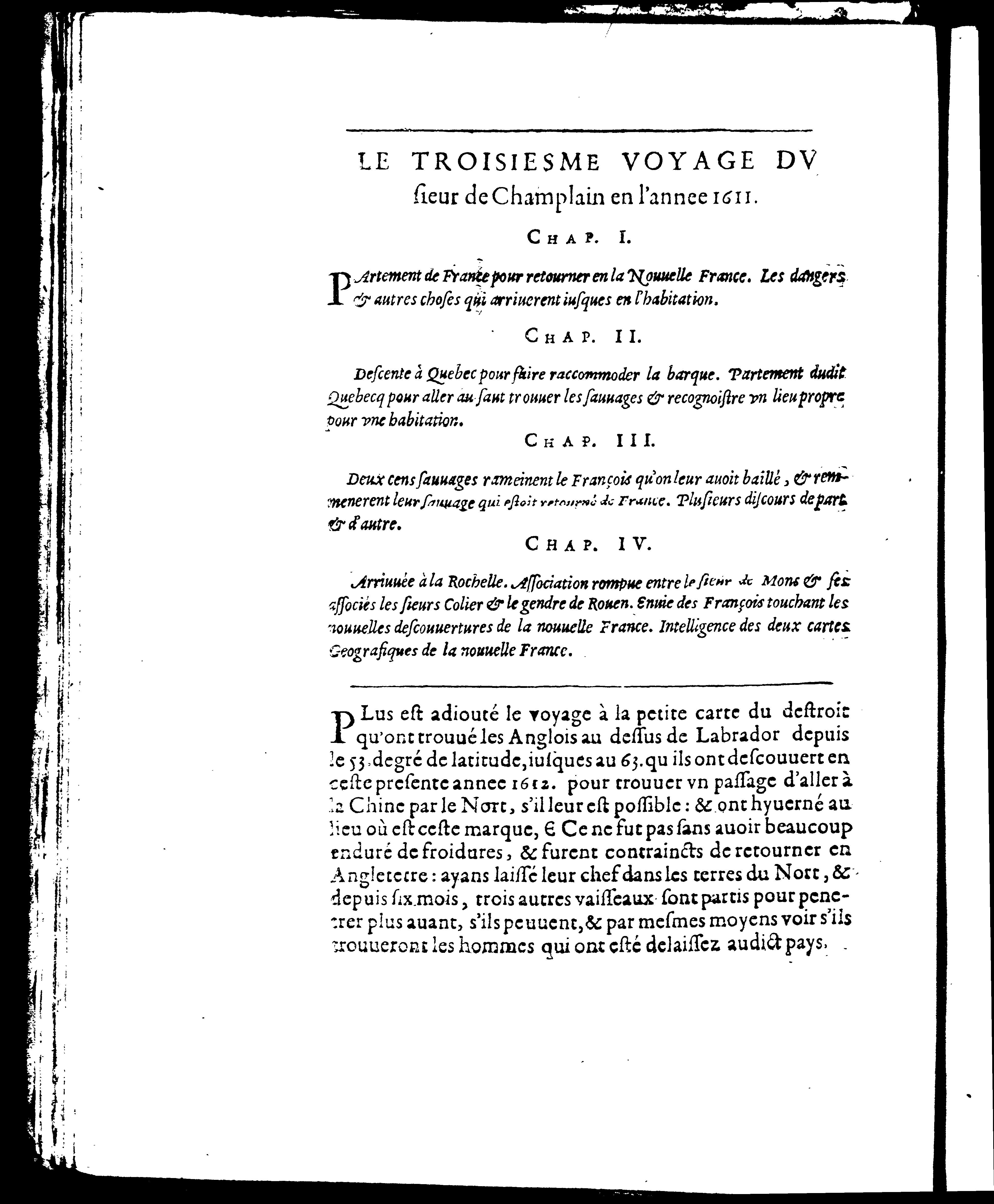 Les voyages du Sieur de Champlain Xaintongeois, capitaine ordinaire pour le Roy, en la marine : divisez en deux livres, ou, journal très-fidèle des observations faites ès des couvertures de la Nouvelle France, tant en la descriptio des terres, costes, rivières, ports, havres, leurs hauteurs, & plusieurs déclinaisons de la guide-aymant ...