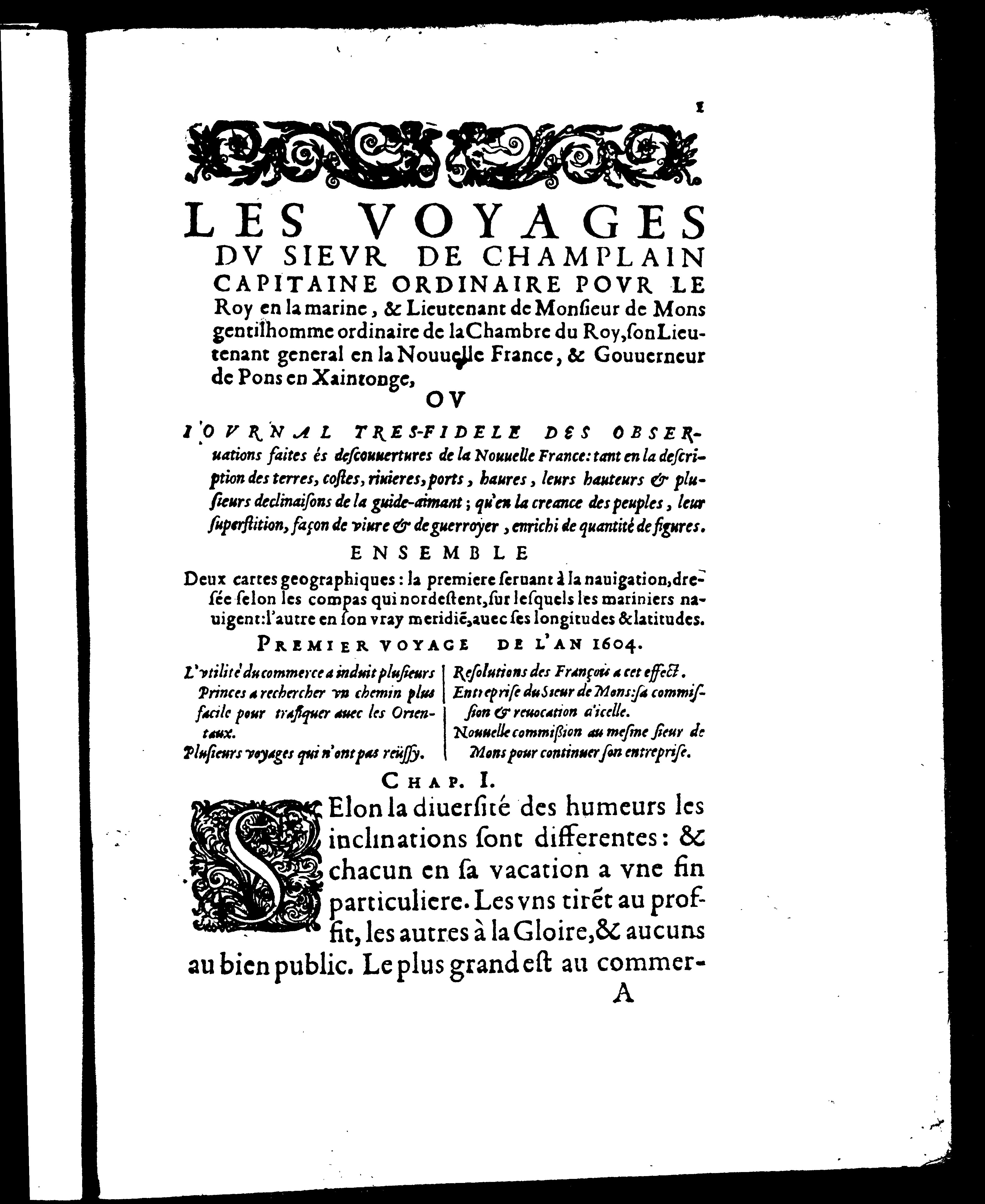 Les voyages du Sieur de Champlain Xaintongeois, capitaine ordinaire pour le Roy, en la marine : divisez en deux livres, ou, journal très-fidèle des observations faites ès des couvertures de la Nouvelle France, tant en la descriptio des terres, costes, rivières, ports, havres, leurs hauteurs, & plusieurs déclinaisons de la guide-aymant ...