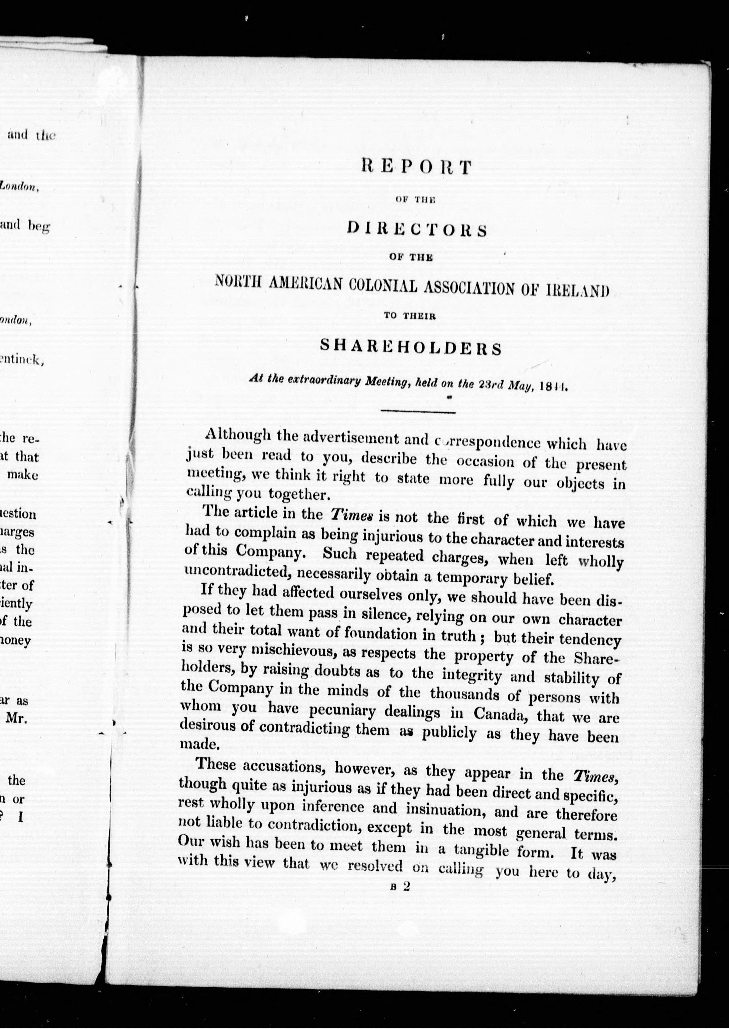 Report, as taken by Messrs. W.B. Gurney and Sons, of an extraordinary meeting of the shareholders of the North American Colonial Association of Ireland : held at the company's office, Broad Street Buildings, on Thursday the 23rd May, 1844. - Published