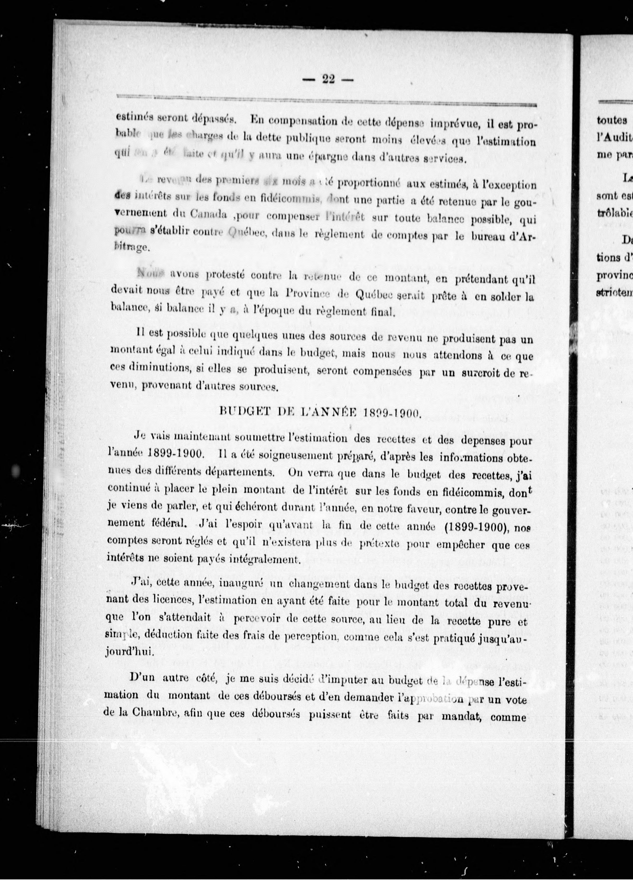 Discours sur le budget prononcé par l'Honorable F.G. Marchand, trésorier de la province à l'Assemblée législative de Québec le 7 février 1899.