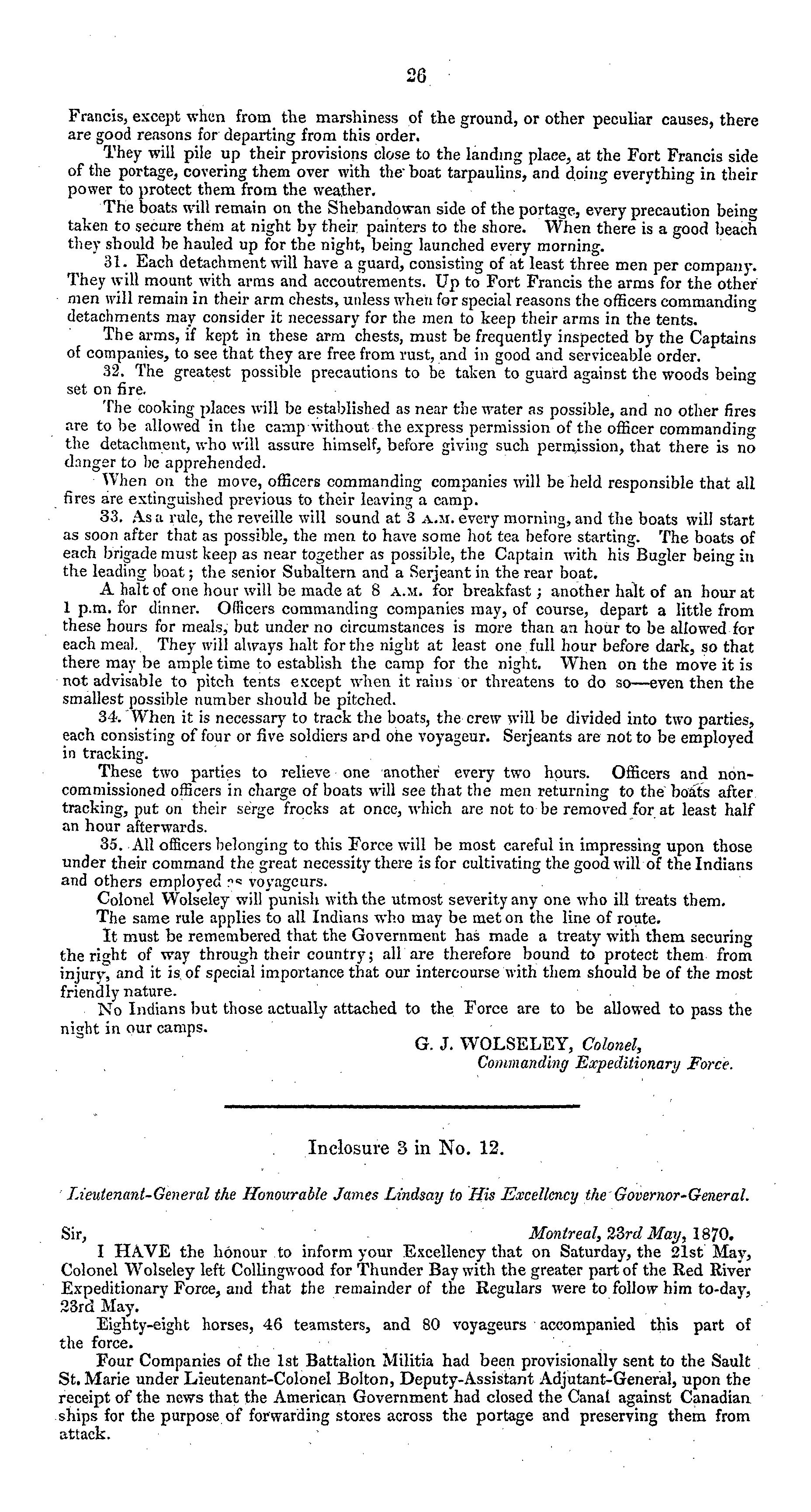 "... Copy of a letter from the Colonial office, containing instructions on certain points connected with your mission to Canada ... It is possible that General Lindsay may be required by Sir John Young to send to the Red River Territory a detachment ..."