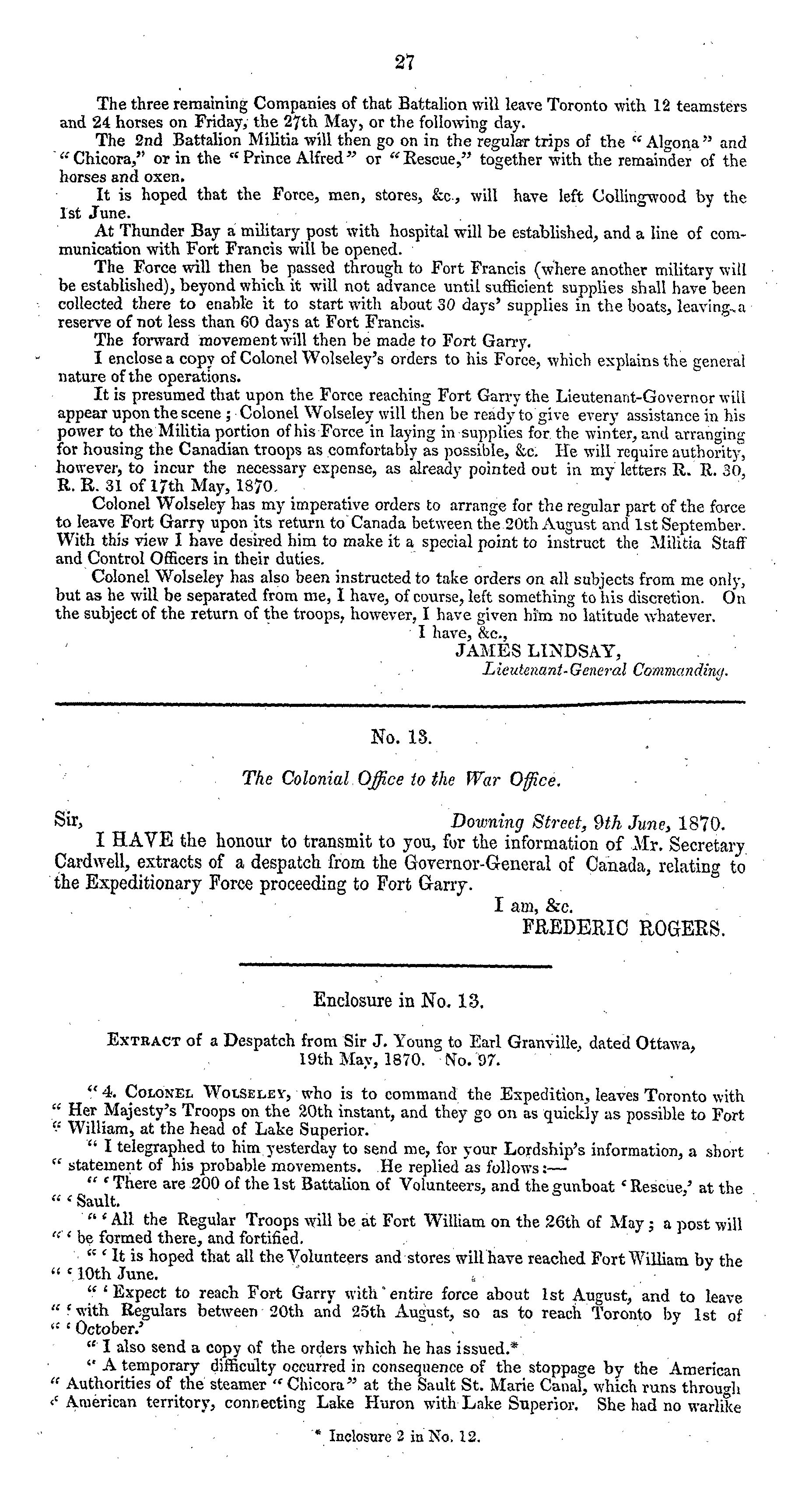 "... Copy of a letter from the Colonial office, containing instructions on certain points connected with your mission to Canada ... It is possible that General Lindsay may be required by Sir John Young to send to the Red River Territory a detachment ..."