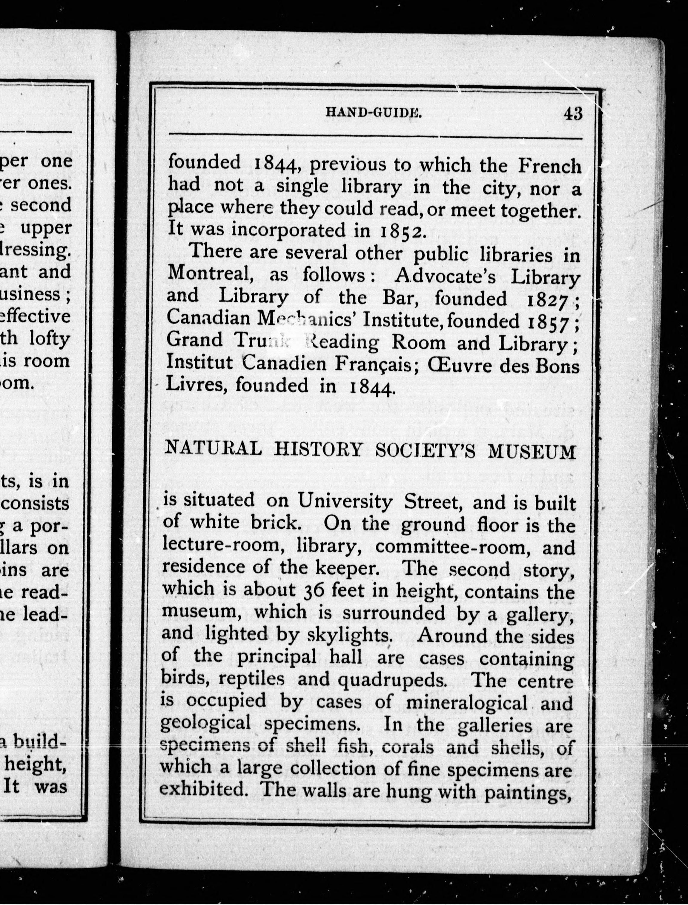 - Hand-guide to Montreal, with map of the city : containing all necessary information and advice for strangers, including rates of money, carriage tariff, institutions and other places of interest to visit, when and how to see them, fancy and fashionable stores, &c.