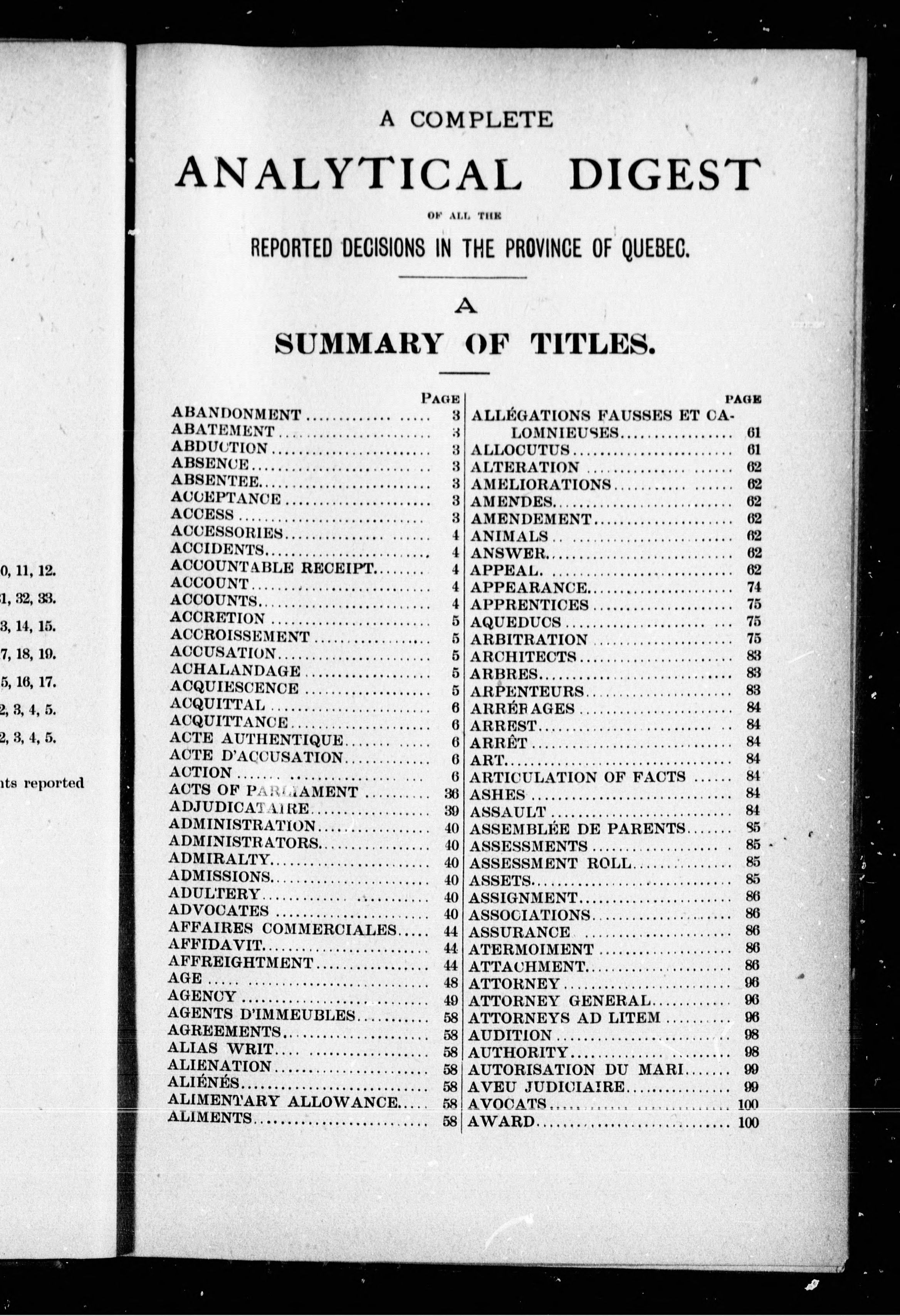 The Quebec law digest ... : being a complete compilation of all the reported decisions in the Province of Quebec, from the first January, 1885, to the first January, 1890 : together with a large number of important decisions, not otherwise reported : the whole analytically digested and arranged, with constant references to the codes and statutes in relation thereto
