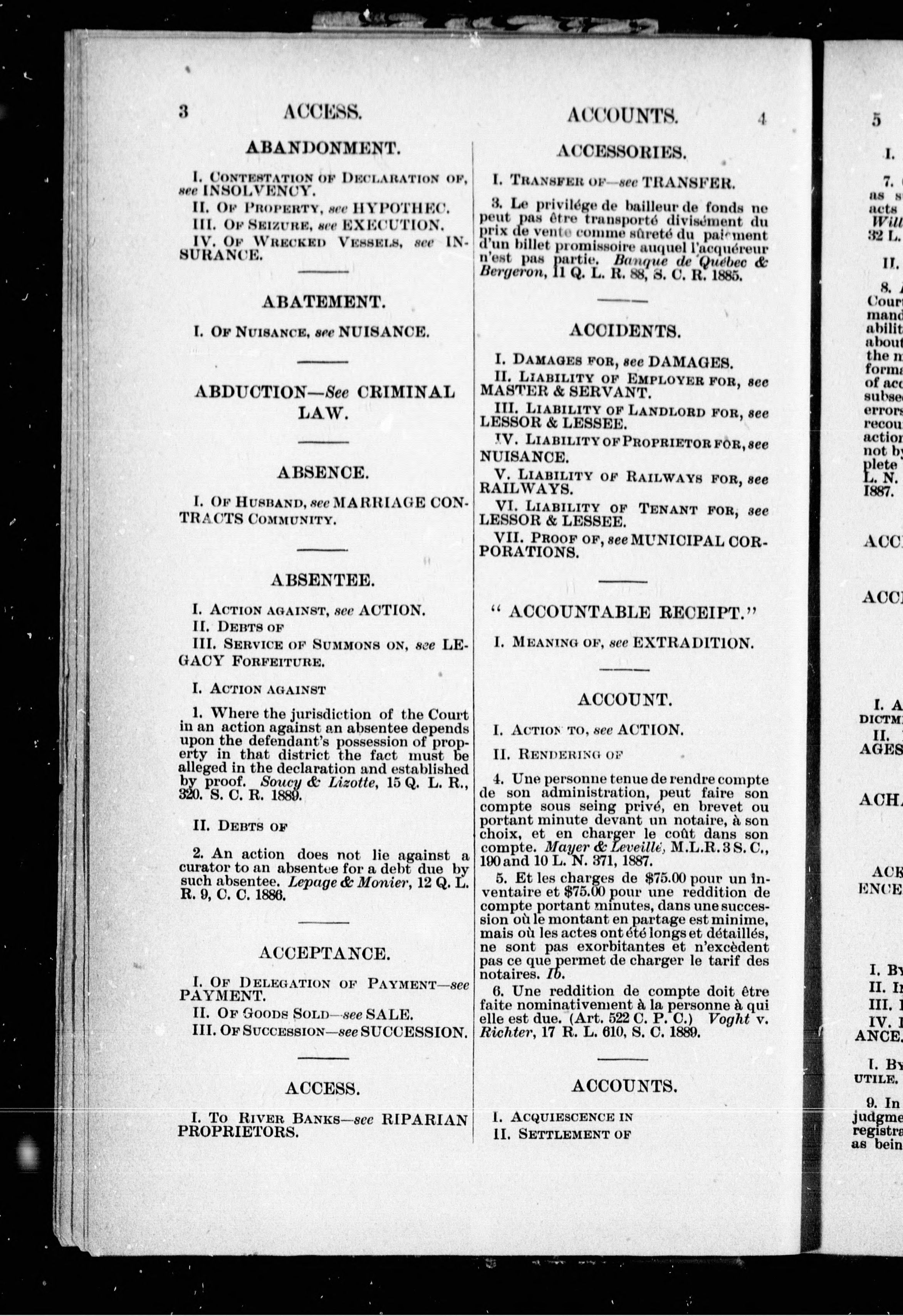 The Quebec law digest ... : being a complete compilation of all the reported decisions in the Province of Quebec, from the first January, 1885, to the first January, 1890 : together with a large number of important decisions, not otherwise reported : the whole analytically digested and arranged, with constant references to the codes and statutes in relation thereto