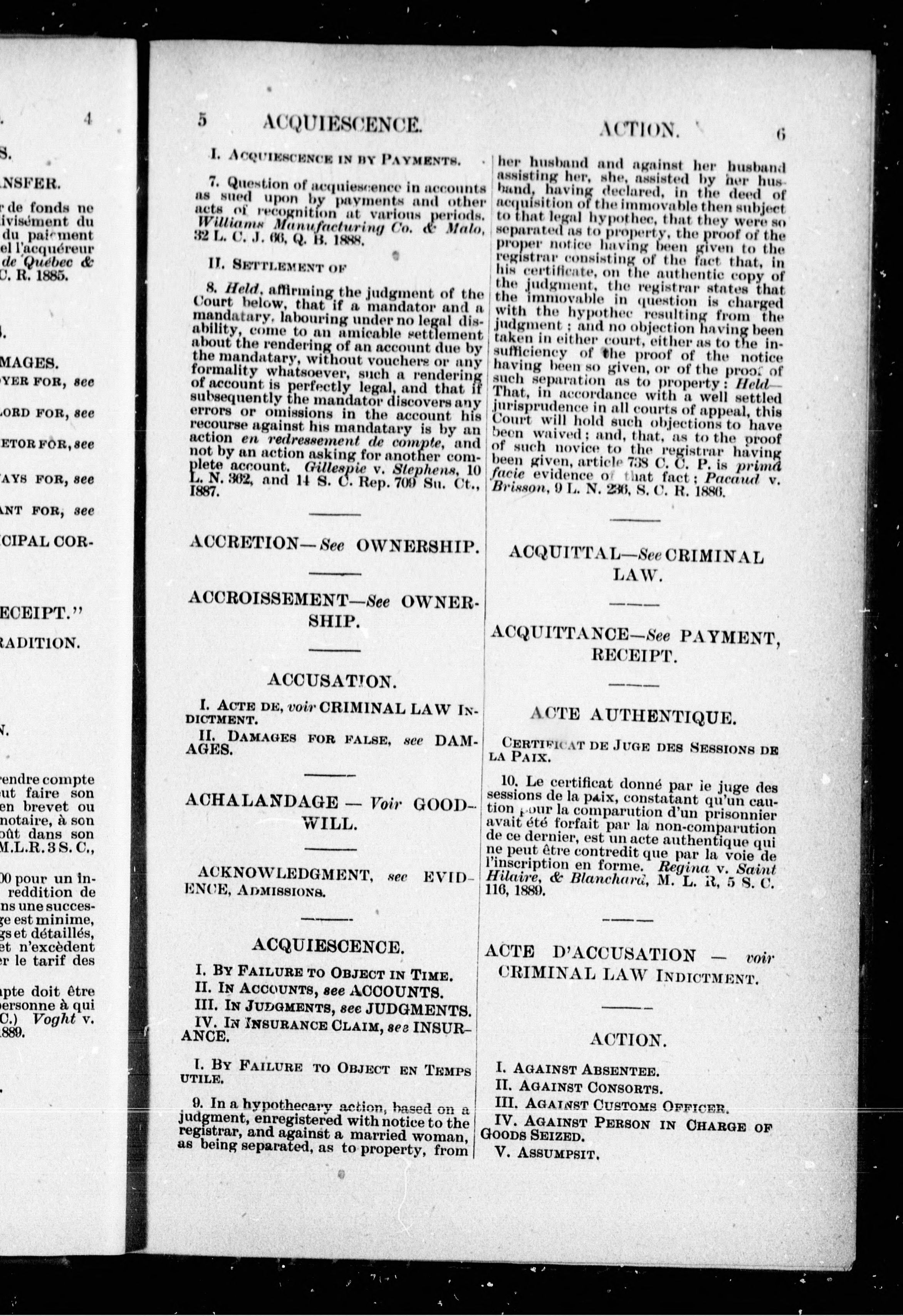 The Quebec law digest ... : being a complete compilation of all the reported decisions in the Province of Quebec, from the first January, 1885, to the first January, 1890 : together with a large number of important decisions, not otherwise reported : the whole analytically digested and arranged, with constant references to the codes and statutes in relation thereto