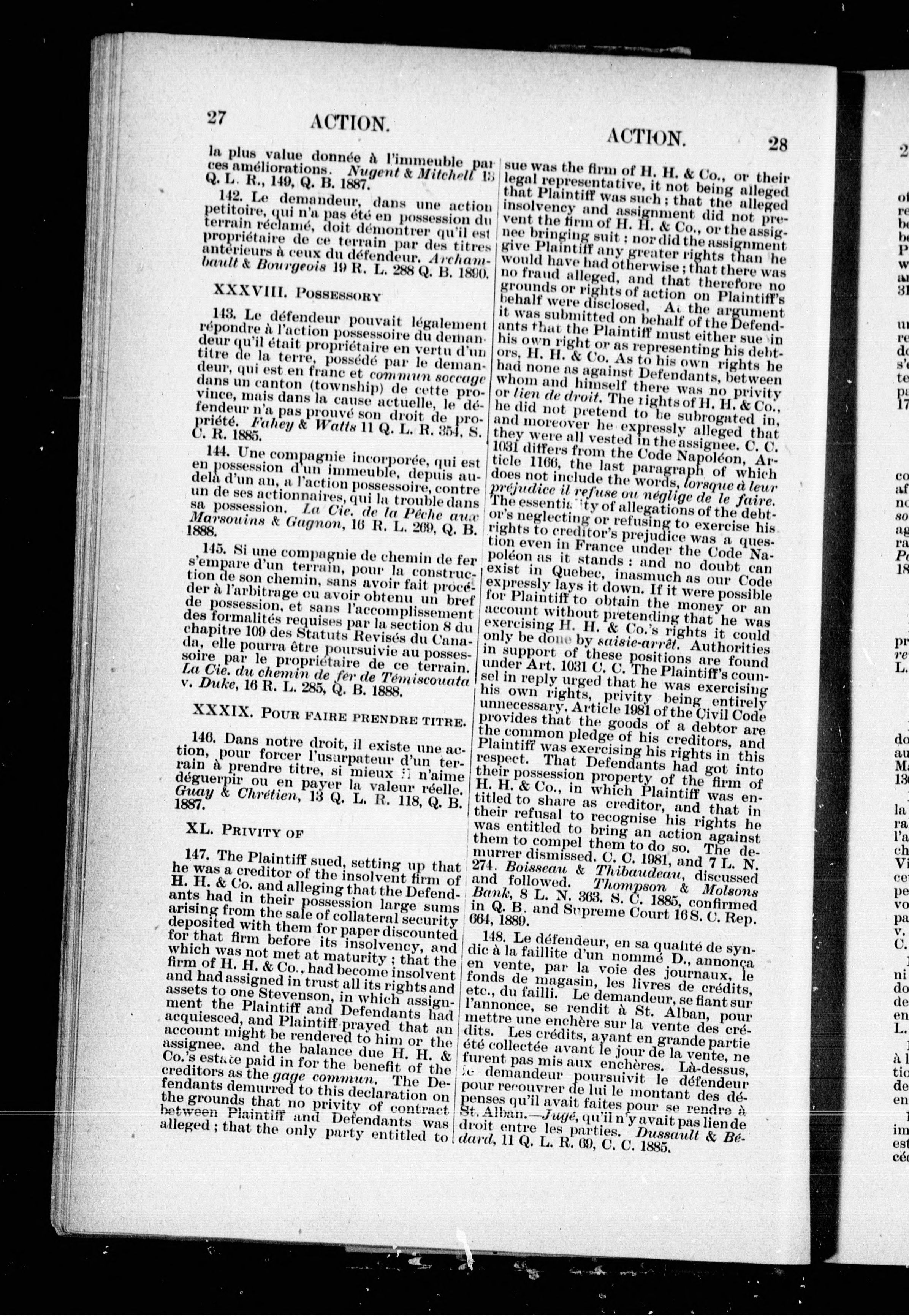 The Quebec law digest ... : being a complete compilation of all the reported decisions in the Province of Quebec, from the first January, 1885, to the first January, 1890 : together with a large number of important decisions, not otherwise reported : the whole analytically digested and arranged, with constant references to the codes and statutes in relation thereto