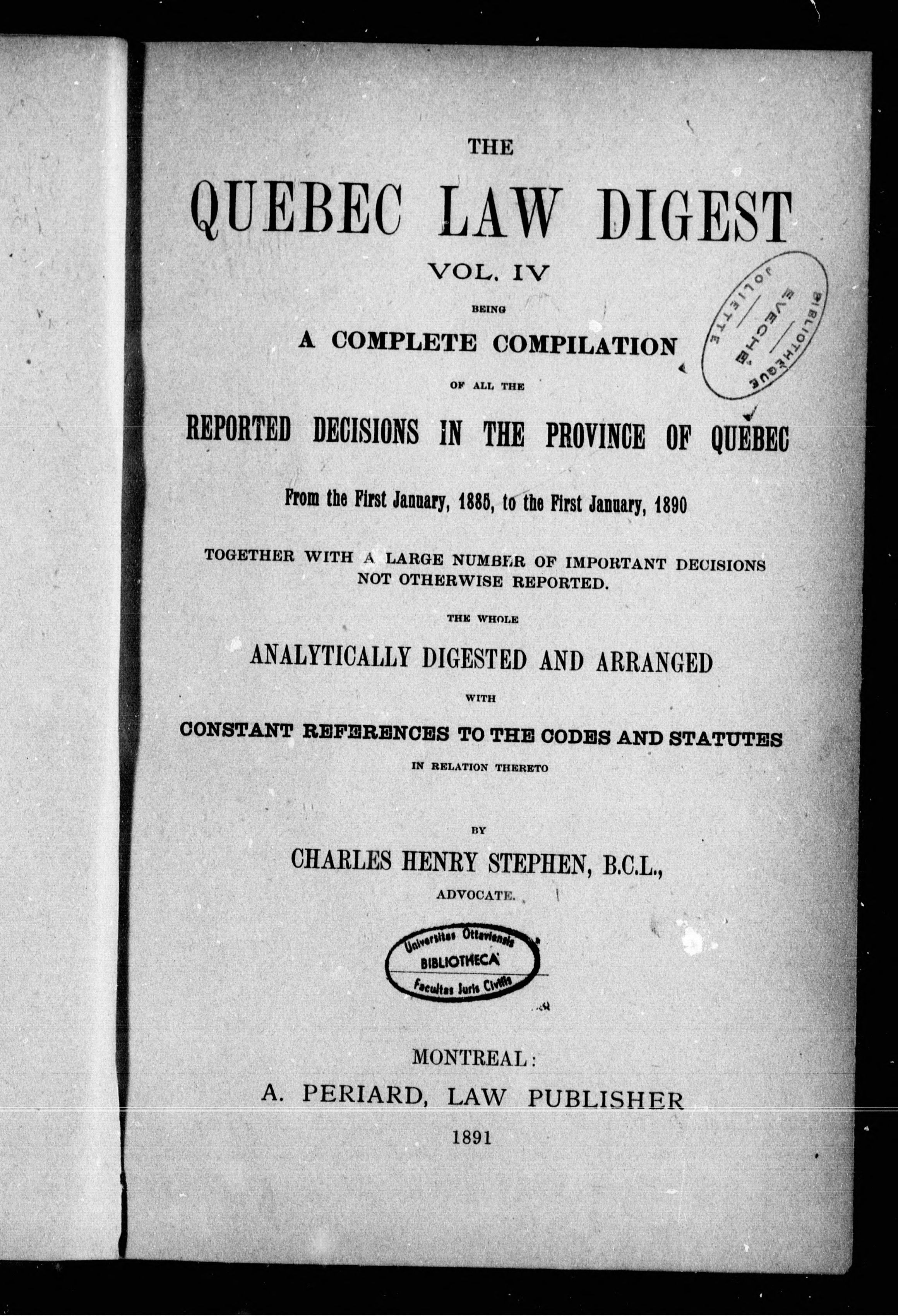 The Quebec law digest ... : being a complete compilation of all the reported decisions in the Province of Quebec, from the first January, 1885, to the first January, 1890 : together with a large number of important decisions, not otherwise reported : the whole analytically digested and arranged, with constant references to the codes and statutes in relation thereto