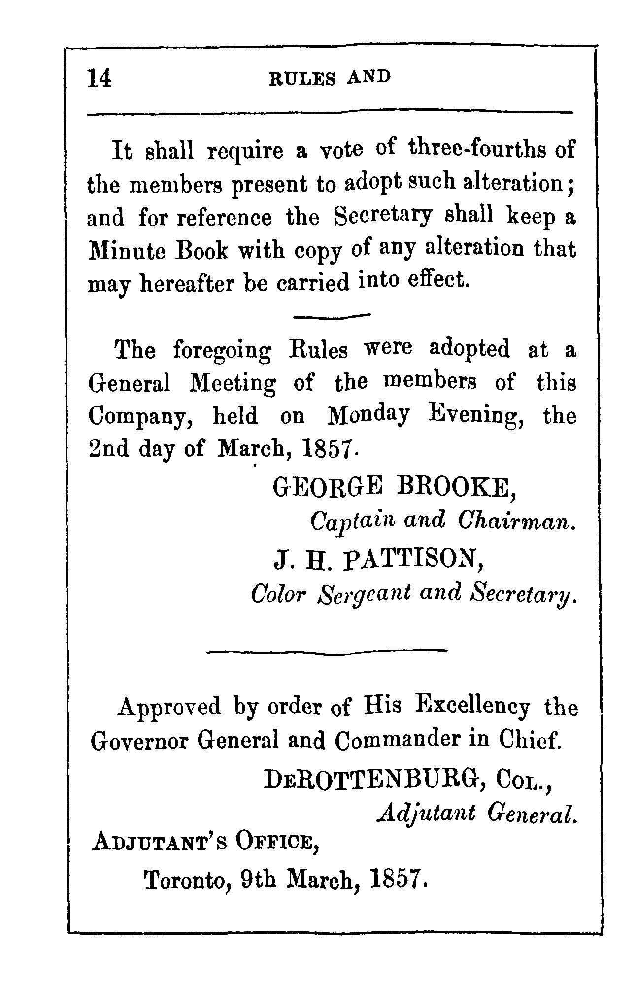 "Approved by order of His Excellency the Governor General and Commander in Chief. DeRottenburg, Col, Adjutant General. Adjutant's Office, Toronto, 9th March, 1857."--p. 14.