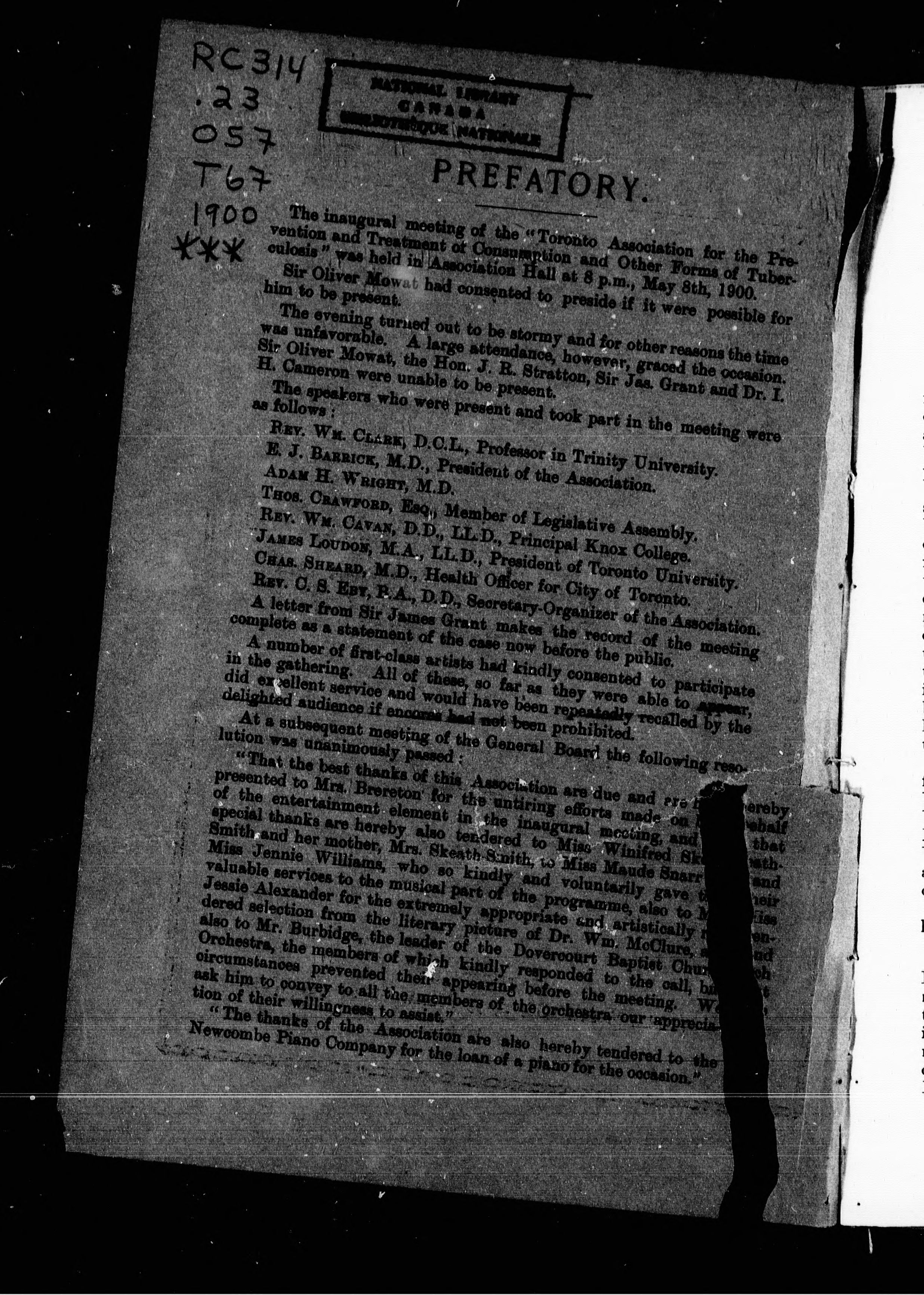 Report of the inaugural meeting of the Toronto Association for the Prevention and Treatment of Consumption and other forms of Tuberculosis, held in Association Hall, May 8th, 1900.