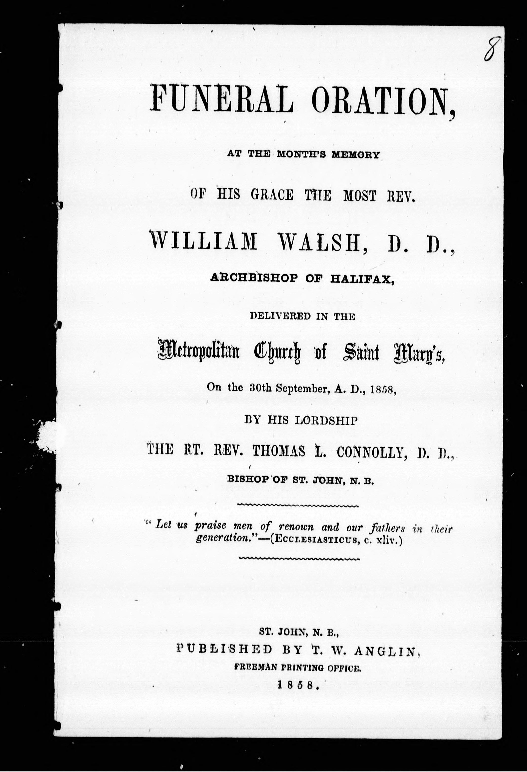 - Funeral oration, at the month's memory of His Grace the Most Rev. William Walsh, D.D., Archbishop of Halifax : delivered in the Metropolitan Church of Saint Mary's, on the 30th September, A. D., 1858