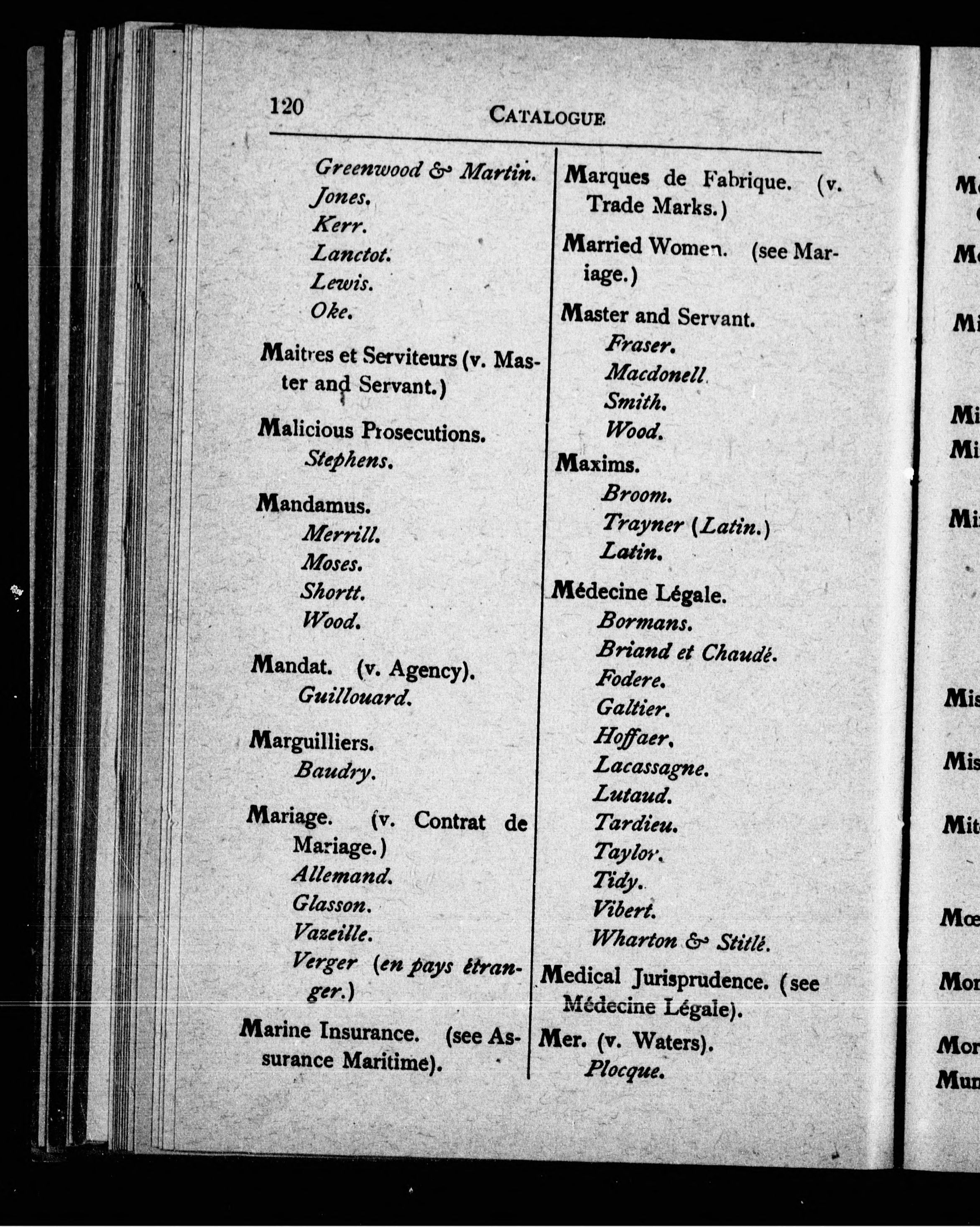 Added t.p. in french: Catalogue de nouveaux livres de droit et de jurisprudence, français, anglais, américains et canadiens, classé dans l'ordre alphabétique des noms des auteurs avec table alphabétique des matières.
