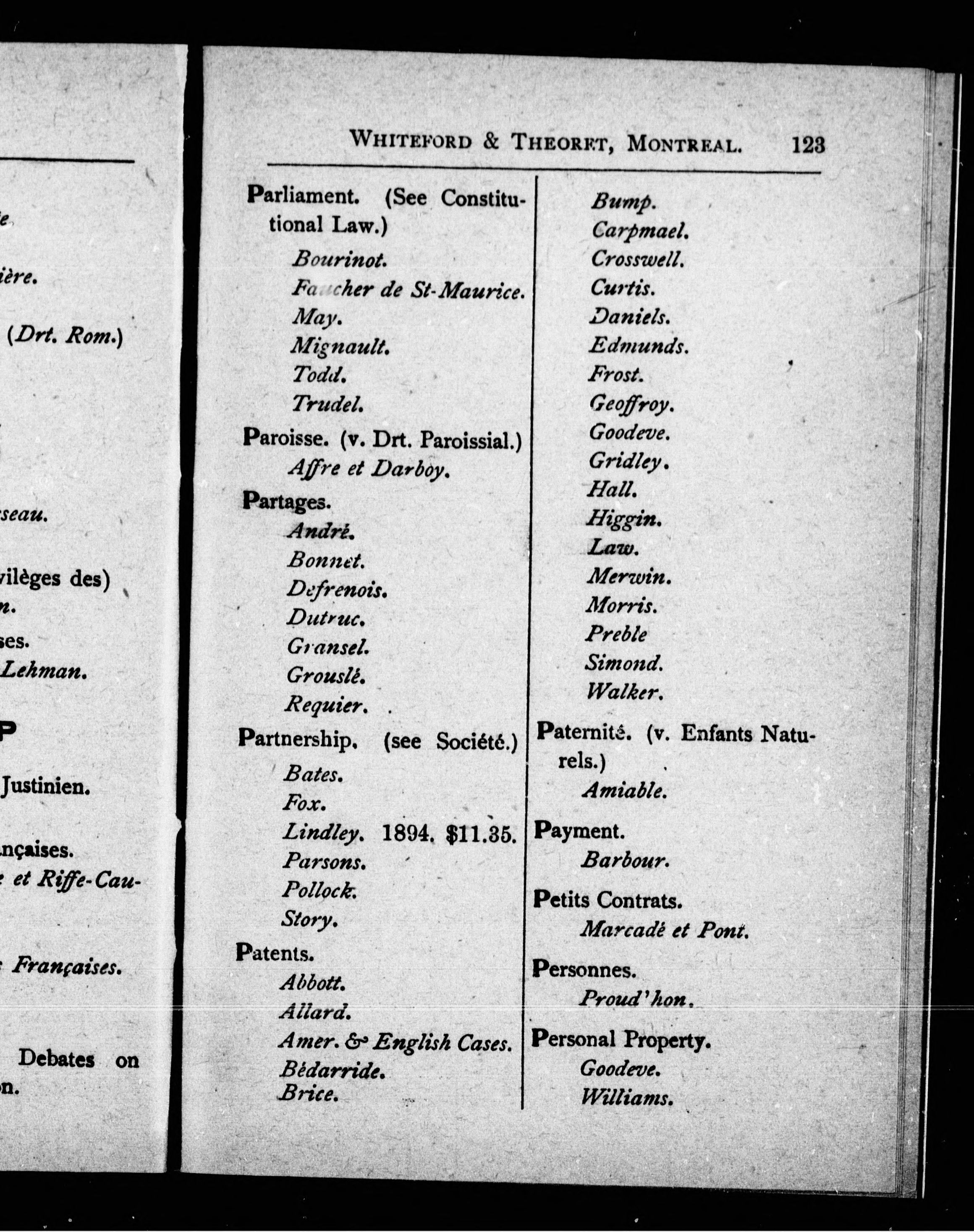 Added t.p. in french: Catalogue de nouveaux livres de droit et de jurisprudence, français, anglais, américains et canadiens, classé dans l'ordre alphabétique des noms des auteurs avec table alphabétique des matières.