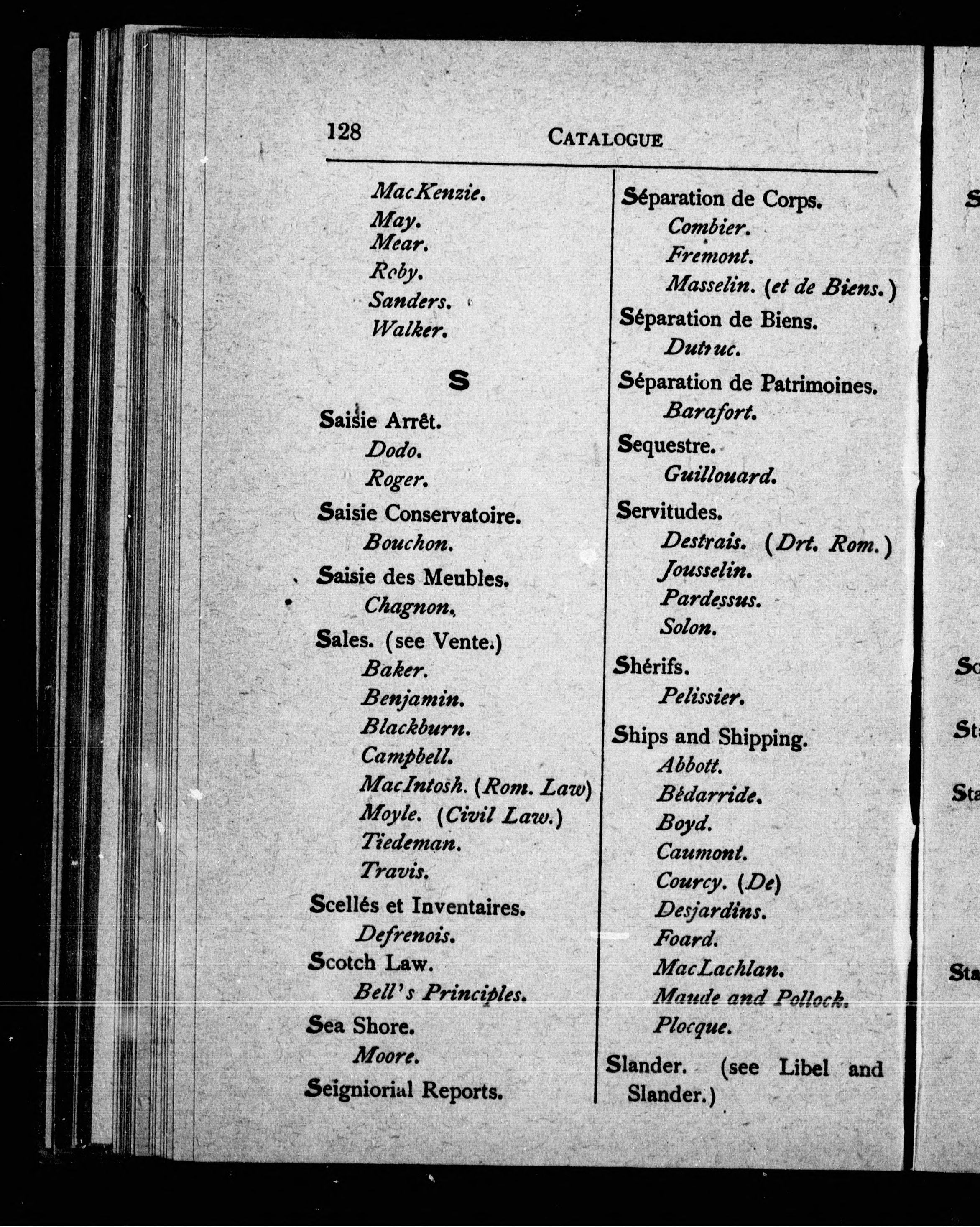 Added t.p. in french: Catalogue de nouveaux livres de droit et de jurisprudence, français, anglais, américains et canadiens, classé dans l'ordre alphabétique des noms des auteurs avec table alphabétique des matières.
