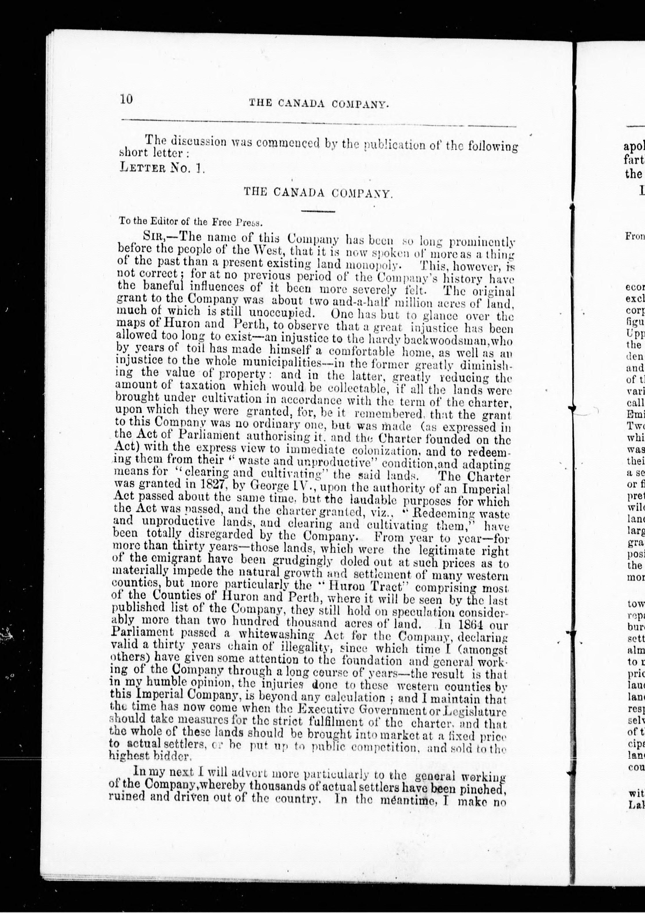 - The Canada Company : feeling in the west : 700,000 acres in western Canada still held by the company : in 1865 the company sold less than 20,000 acres and got back as forfeited 36,000 acres numerously signed memorials presented to Parliament against the company : the county councils of Perth, Huron and Bruce, representing 100,000 souls, petition for an investigation