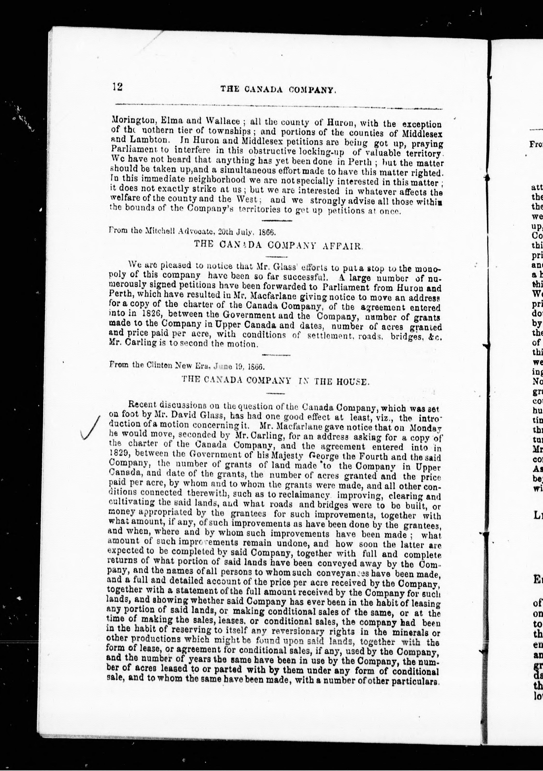 - The Canada Company : feeling in the west : 700,000 acres in western Canada still held by the company : in 1865 the company sold less than 20,000 acres and got back as forfeited 36,000 acres numerously signed memorials presented to Parliament against the company : the county councils of Perth, Huron and Bruce, representing 100,000 souls, petition for an investigation