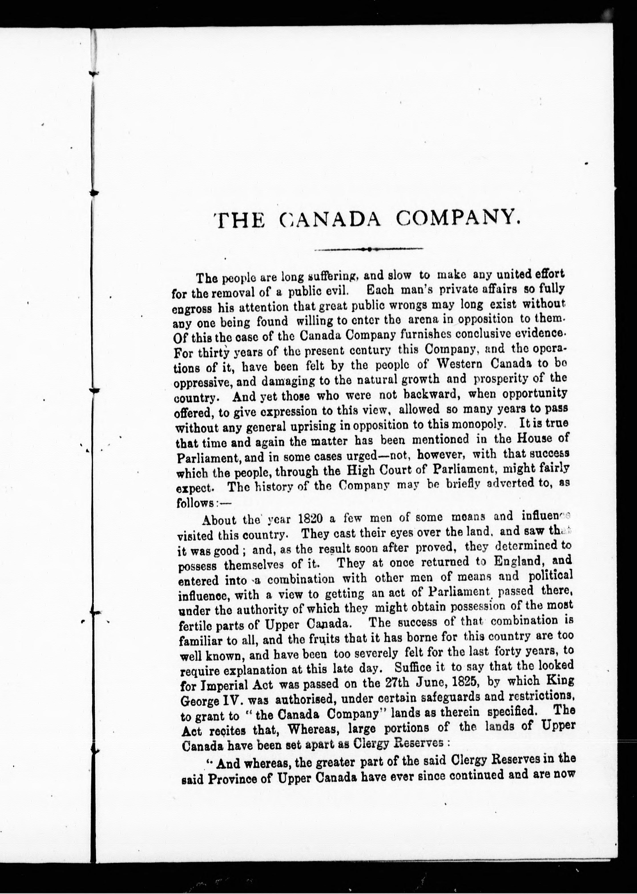 - The Canada Company : feeling in the west : 700,000 acres in western Canada still held by the company : in 1865 the company sold less than 20,000 acres and got back as forfeited 36,000 acres numerously signed memorials presented to Parliament against the company : the county councils of Perth, Huron and Bruce, representing 100,000 souls, petition for an investigation