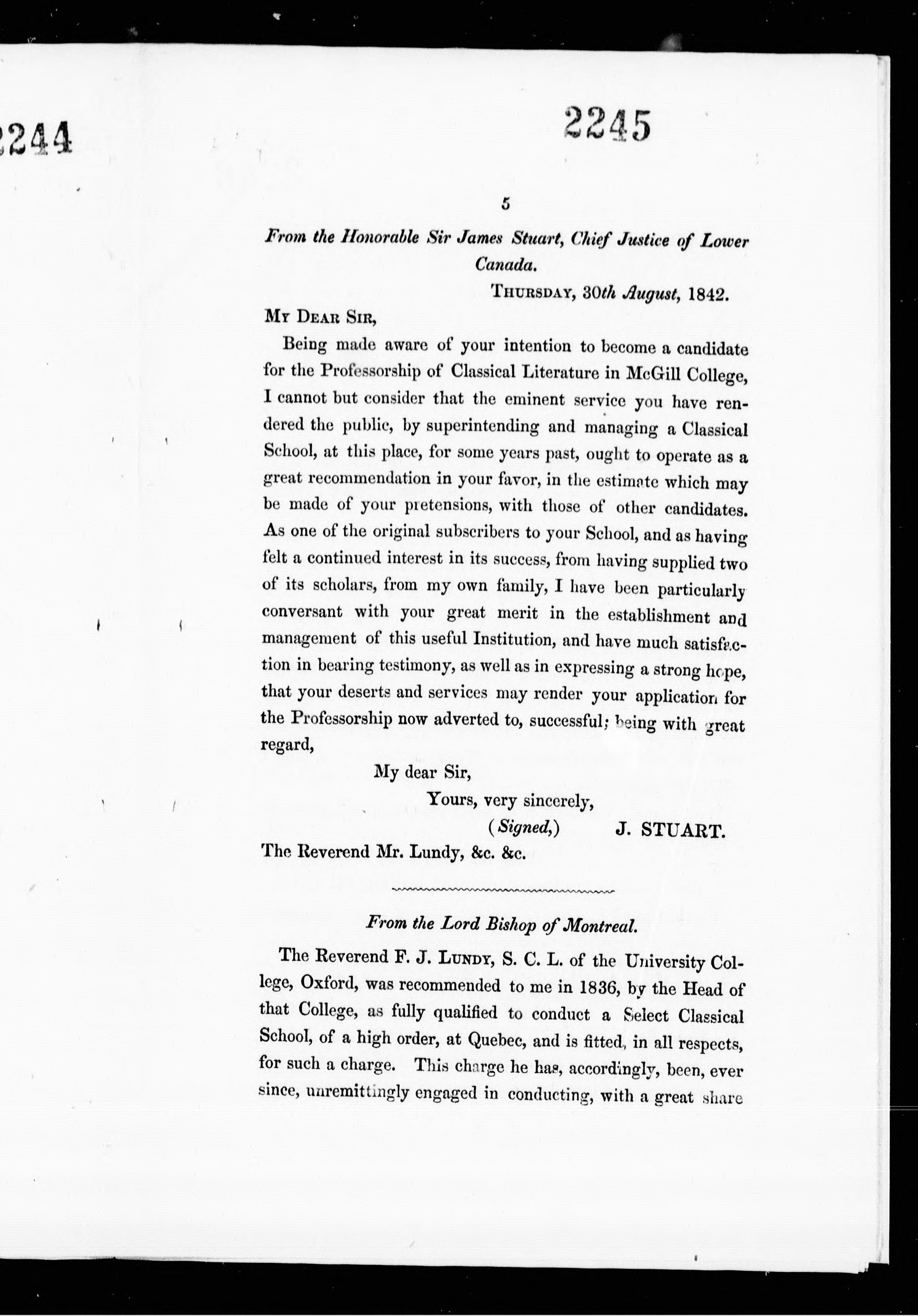 Testimonials on which the Rev. Dr. Lundy, was appointed vice principal, and professor of classical literature in the University of McGill College.
