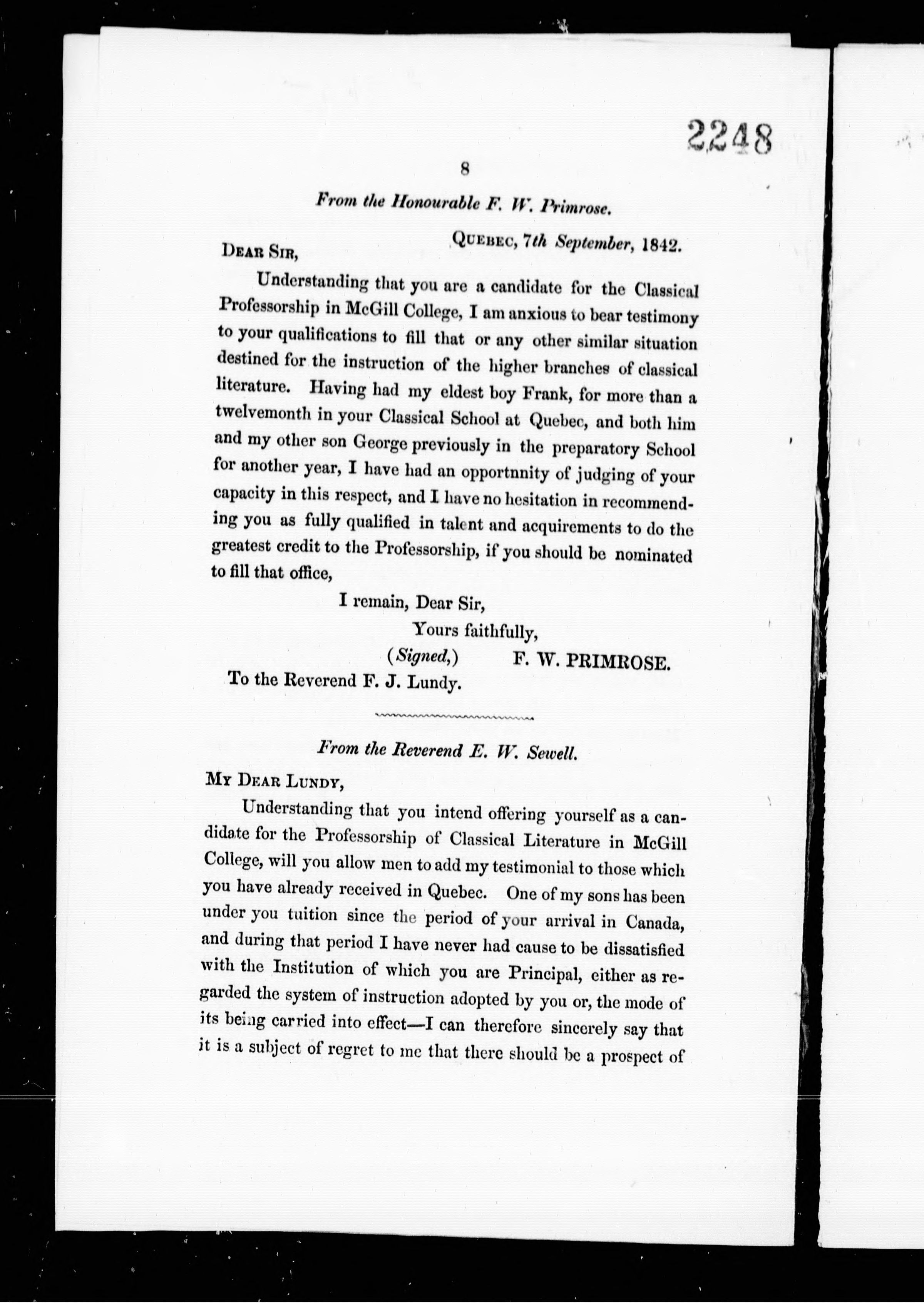 Testimonials on which the Rev. Dr. Lundy, was appointed vice principal, and professor of classical literature in the University of McGill College.