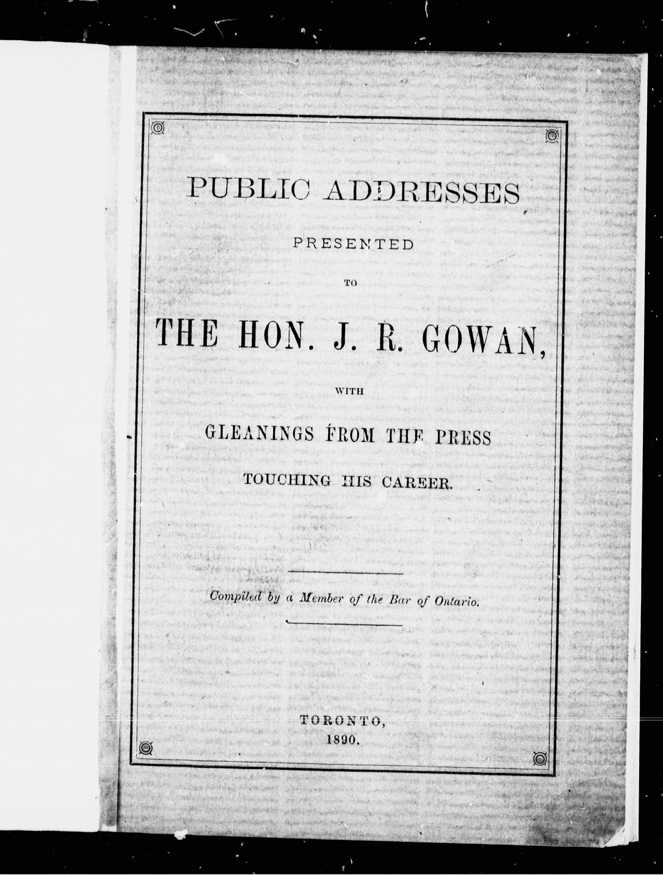 - Public addresses presented to the Hon. J.R. Gowan : with gleanings from the press touching his career