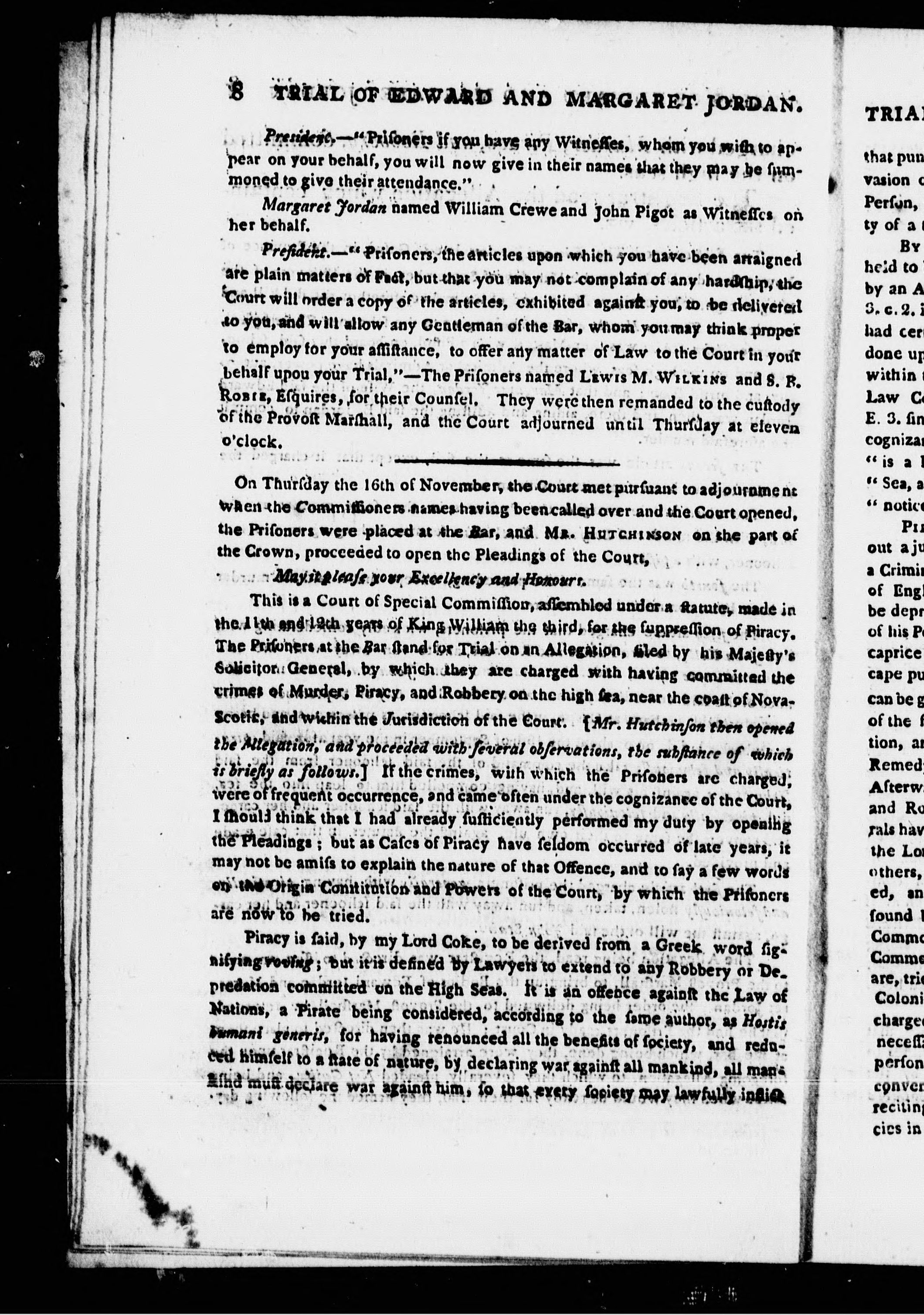 Report of the trial of Edward Jordan, and Margaret Jordan his wife, for piracy & murder, at Halifax on the 15th day of November, 1809, together with Edward Jordan's dying confession : to which is added the trial of John Kelly, for piracy and murder, on the 8th day of December, 1809