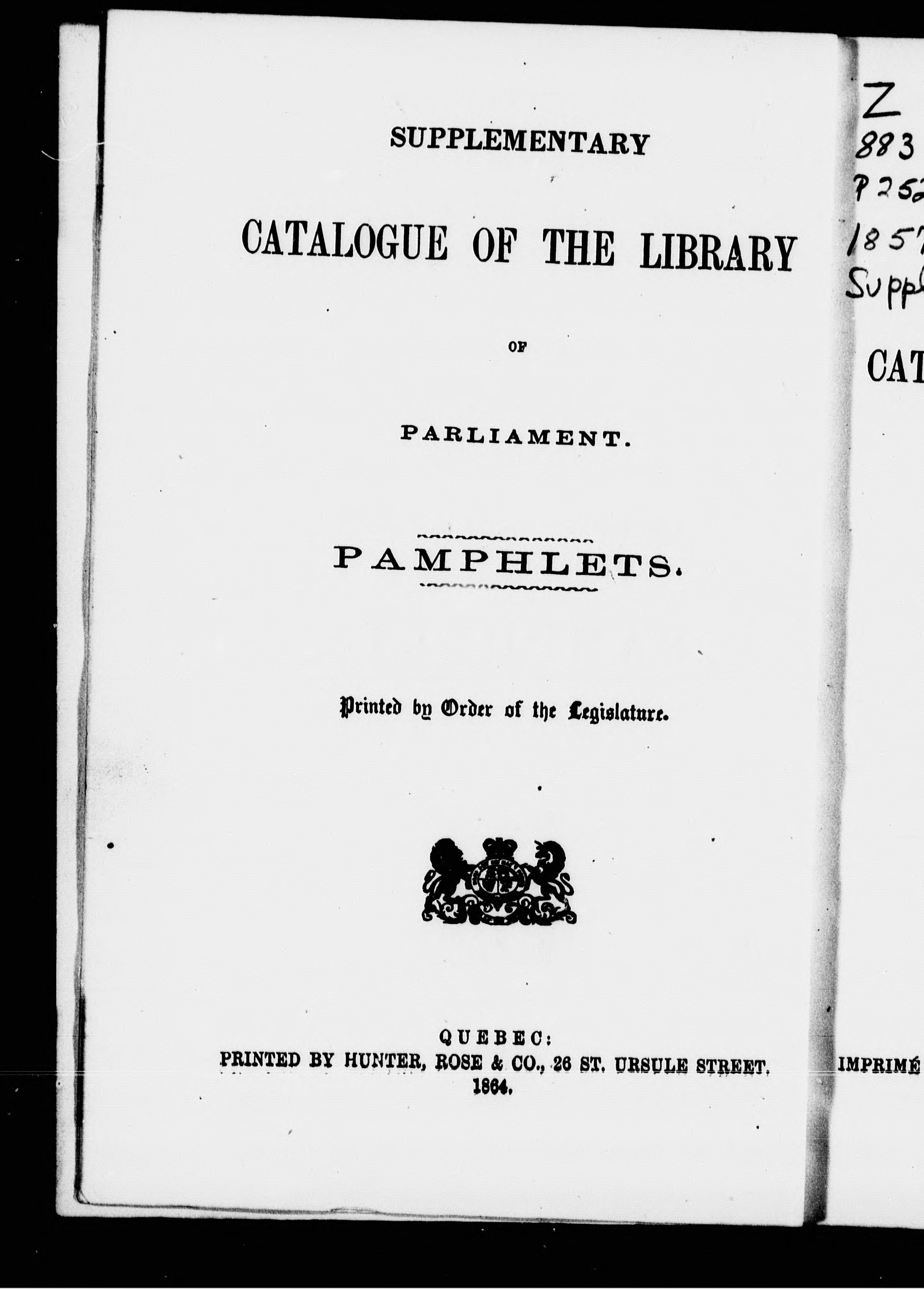 Supplementary catalogue of the Library of Parliament : pamphlets. - Adresse bibliographique