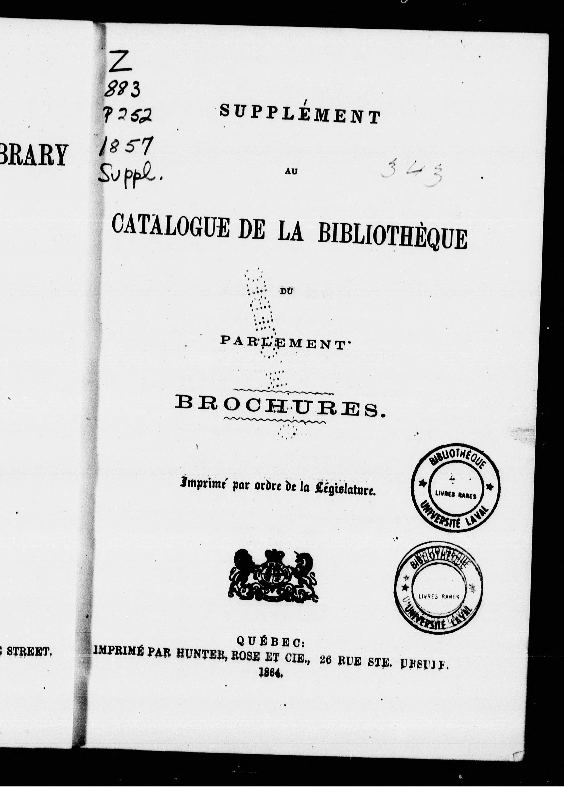 Added t.p. in French: Supplément au catalogue de la Bibliothèque du Parlement : brochures.