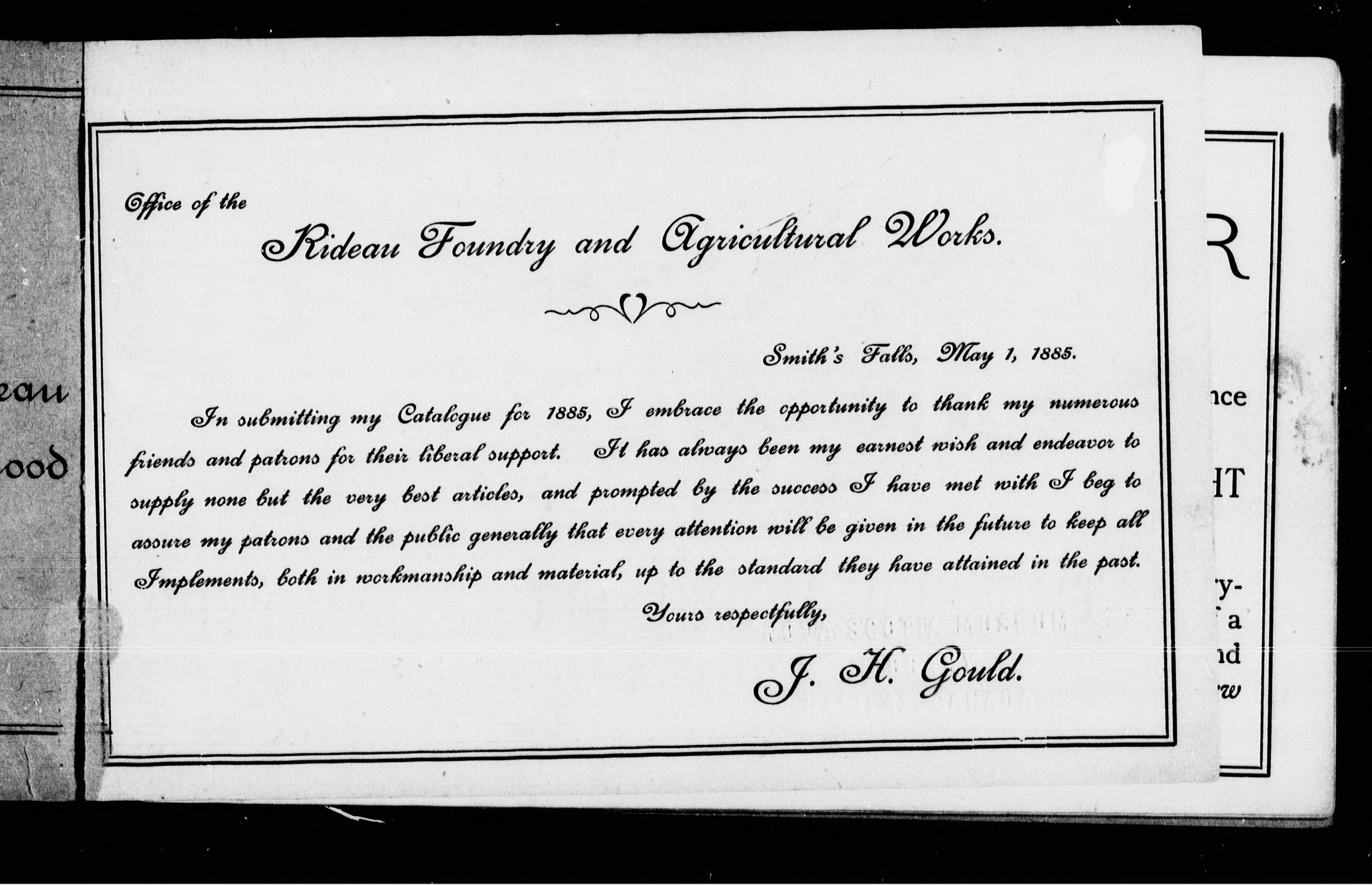 The Rideau Foundry and Agricultural Works illustrated catalogue and price list of implements, etc. : manufactured by J. H. Gould, Smith's Falls, Ont.