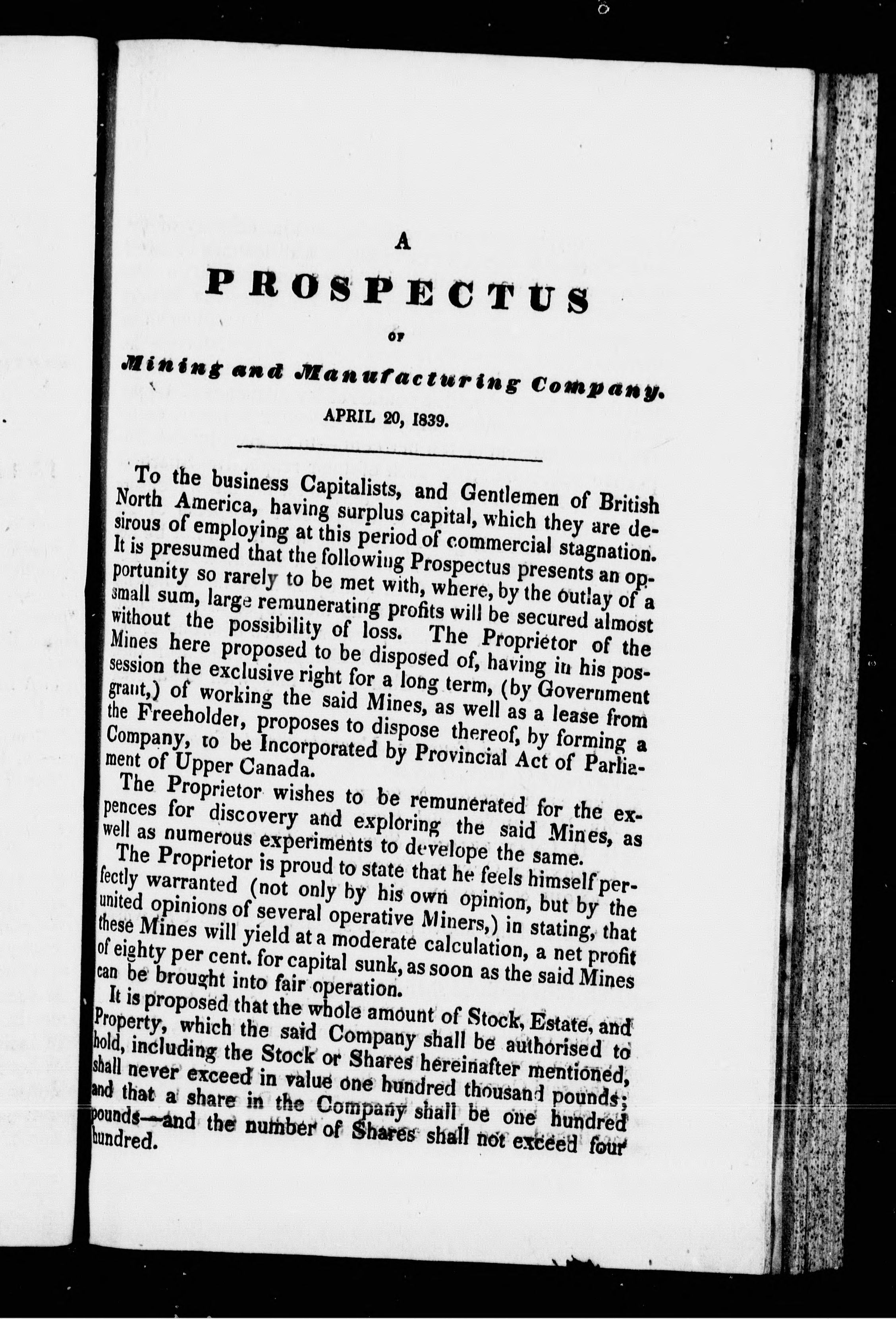 A prospectus of the British & Canadian Mining and Manufacturing Company : situated in the townships of Gainsborough and Clinton, in the District of Niagara, Upper Canada. - Adresse bibliographique