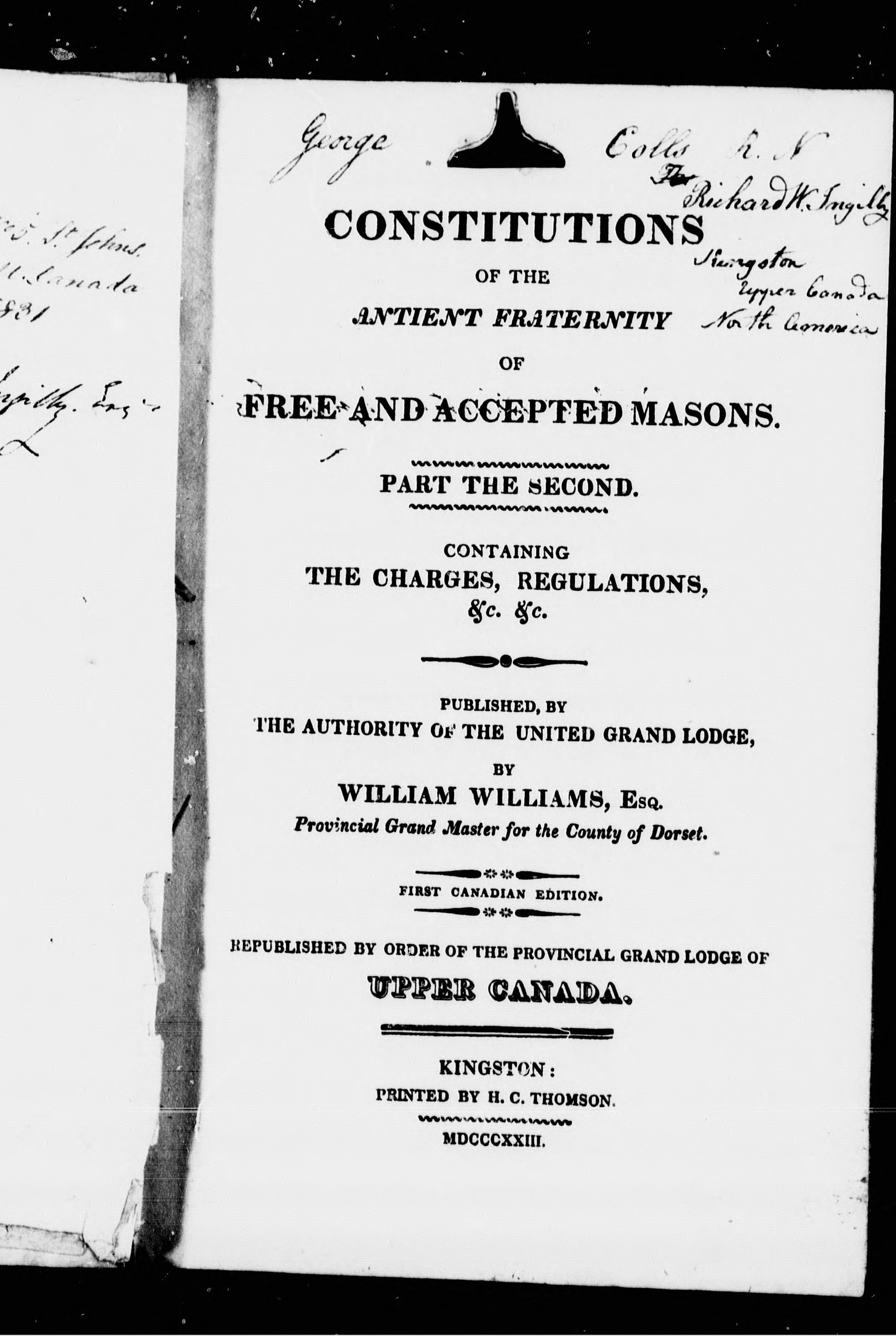 "Published, by the authority of the United Grand Lodge, by William Williams, Esq., provincial Grand Master for the county of Dorset ... republished by the order of the provincial Grand Lodge of Upper Canada."