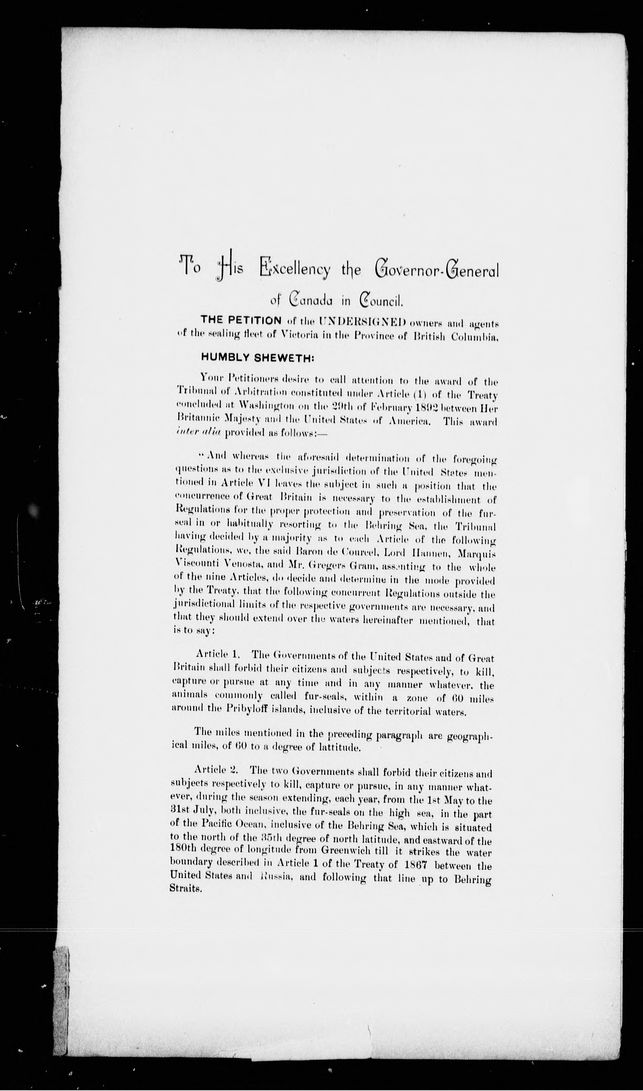 Caption title: To His Excellency the Governor-General of Canada in Council.