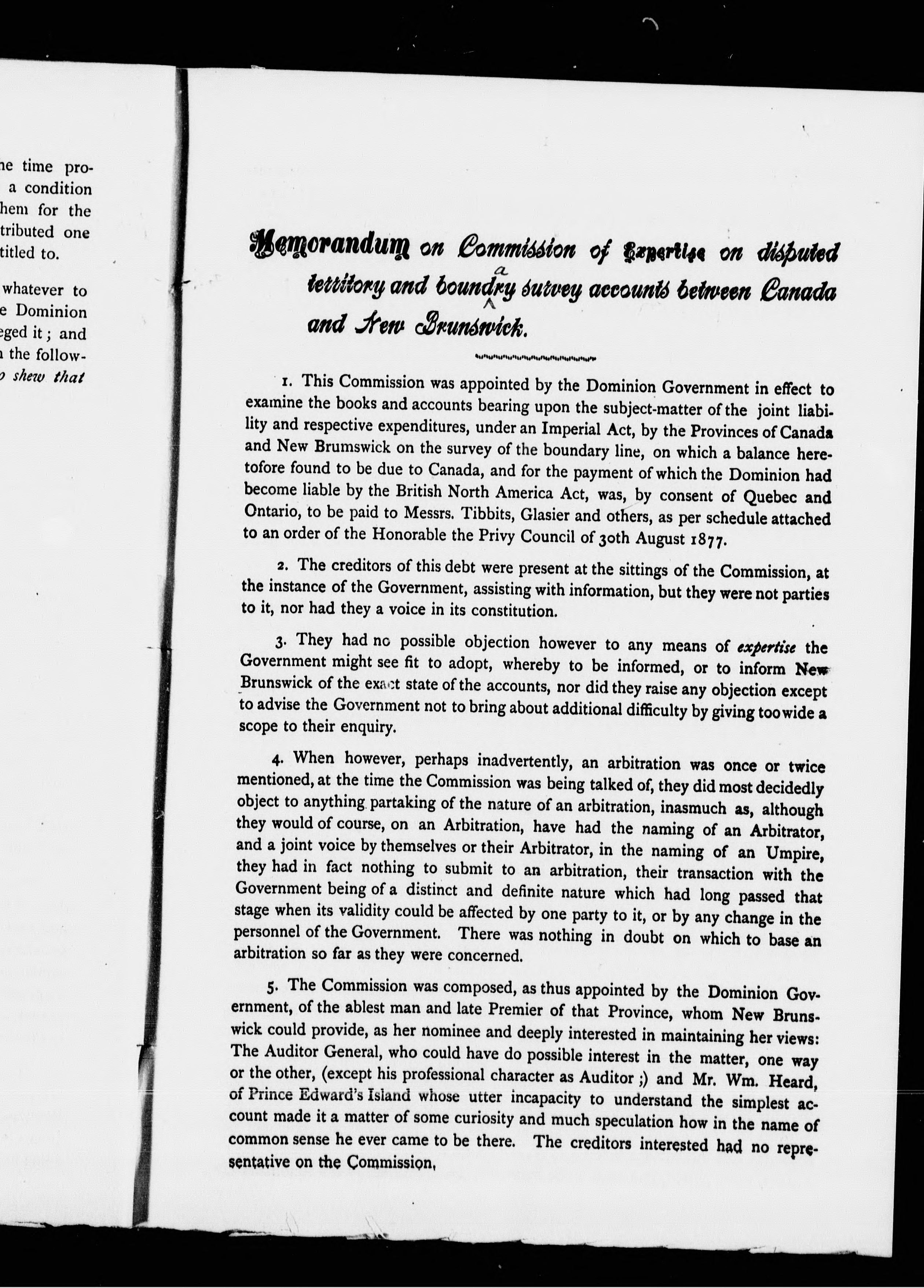 - Memorandum on commission of expertise on disputed territory and boundary survey accounts between New Brunswick and the late Province of Canada