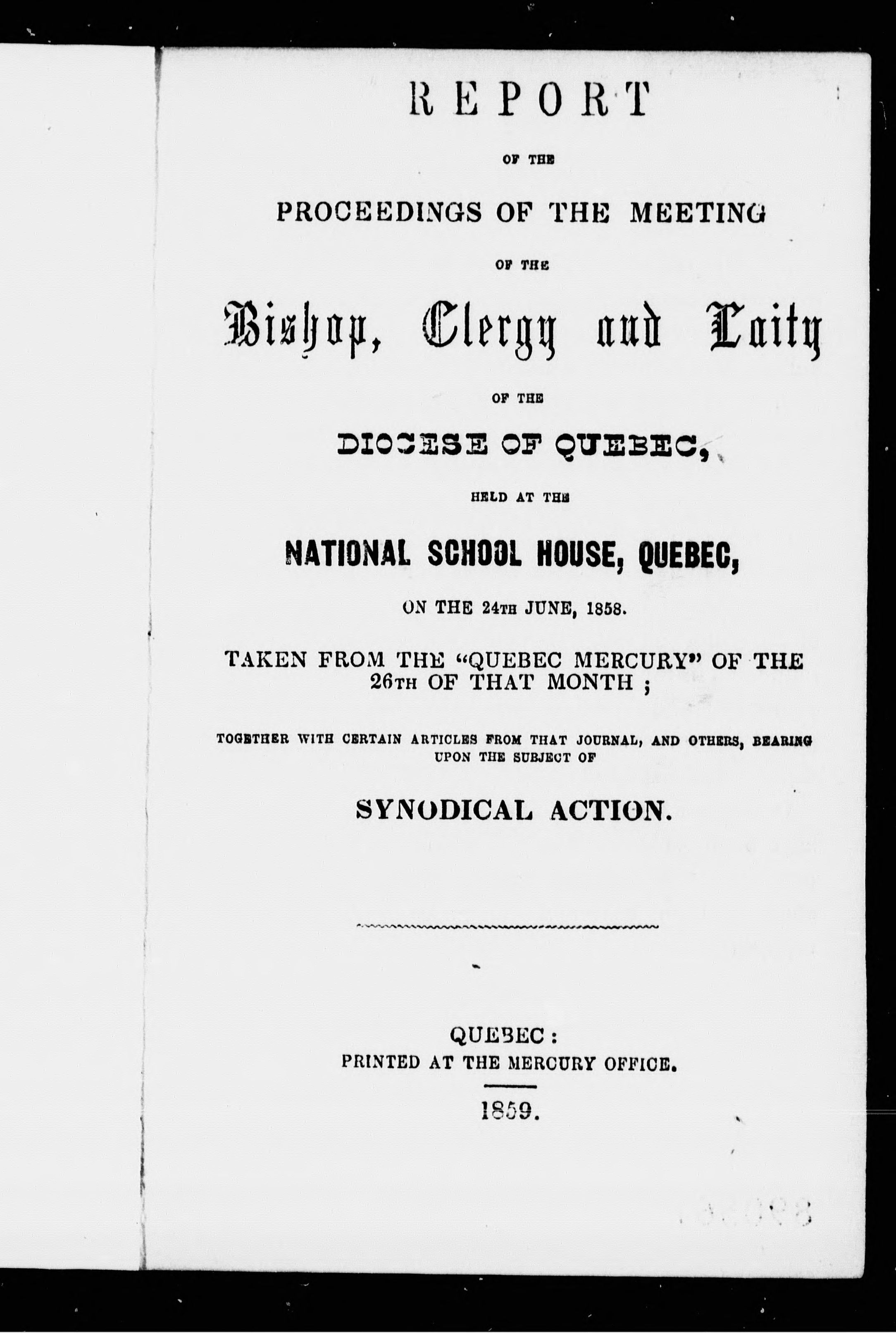 Report of the proceedings of the meeting of the Bishop, clergy and laity of the diocese of Quebec, held at the National School House, Quebec, on the 24th June, 1858 : taken from the "Quebec Mercury" of the 26th of that month ; together with certain articles from that journal, and others, bearing upon the subject of synodical action. - Adresse bibliographique