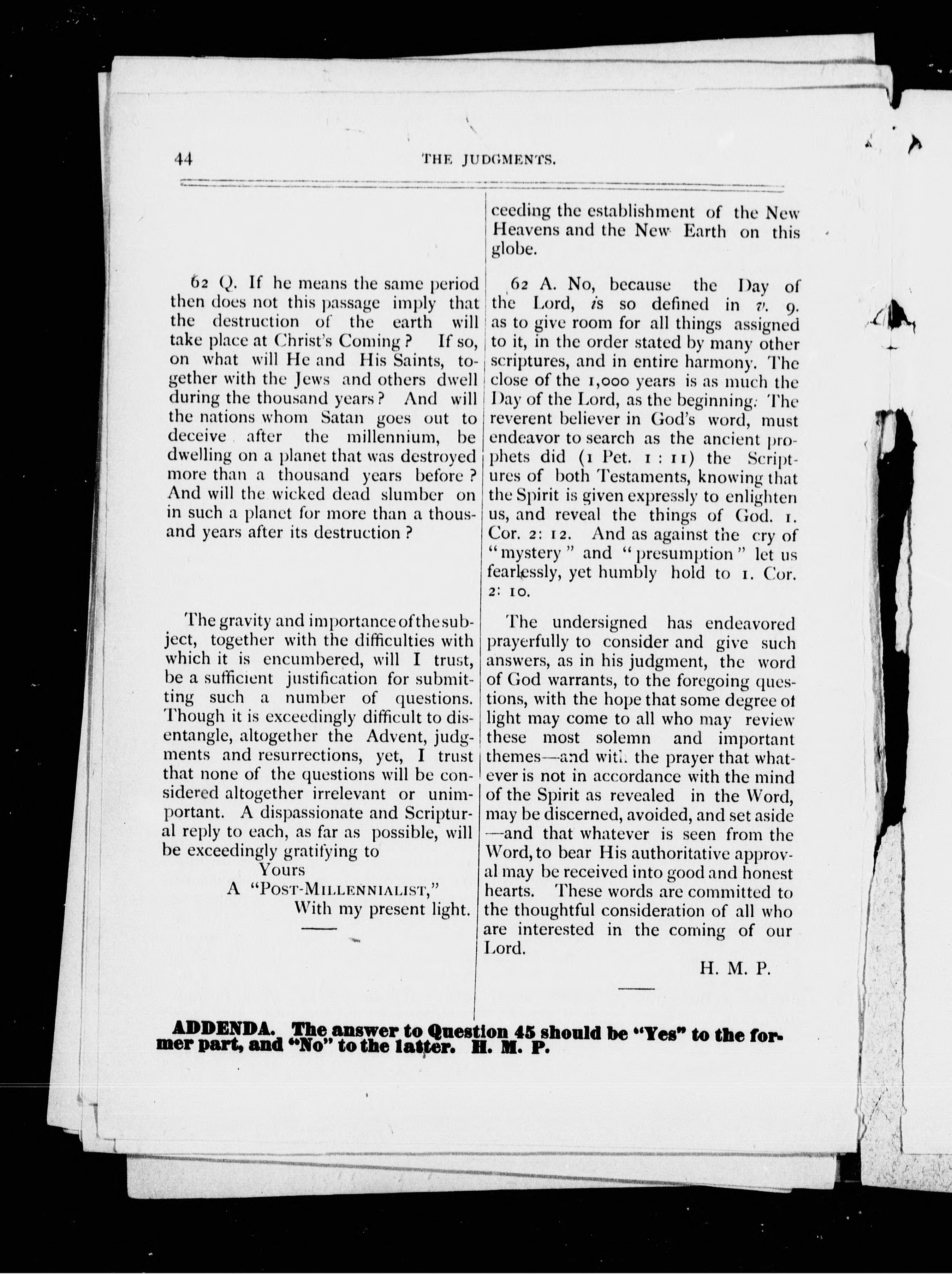 Answers given by H.M. Parsons and John Mutch at a series of meetings held in July 1886 at Parkdale, Ont.--p. [2]