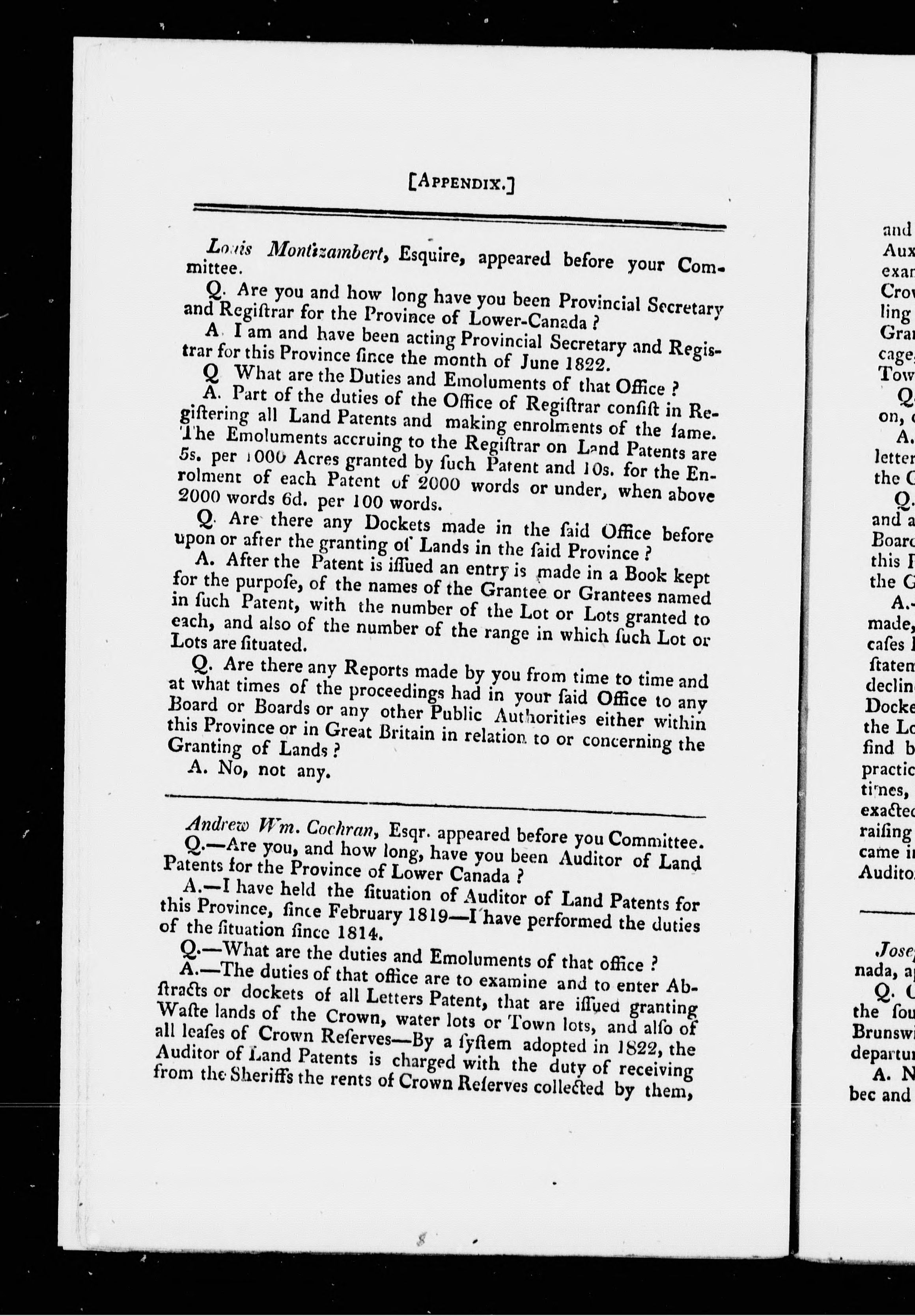 Tenth report of the Committee of the House of Assembly, on that part of the speech of His Excellency the Governor in Chief, which relates to the settlement of the Crown Lands : comprising a report on His Excellency's message relating to the offer, from Lieut. Col. Joseph Bouchette, surveyor general of the province, to the government, of the plates of his maps of Canada : with the minutes of evidence taken before the Committee.