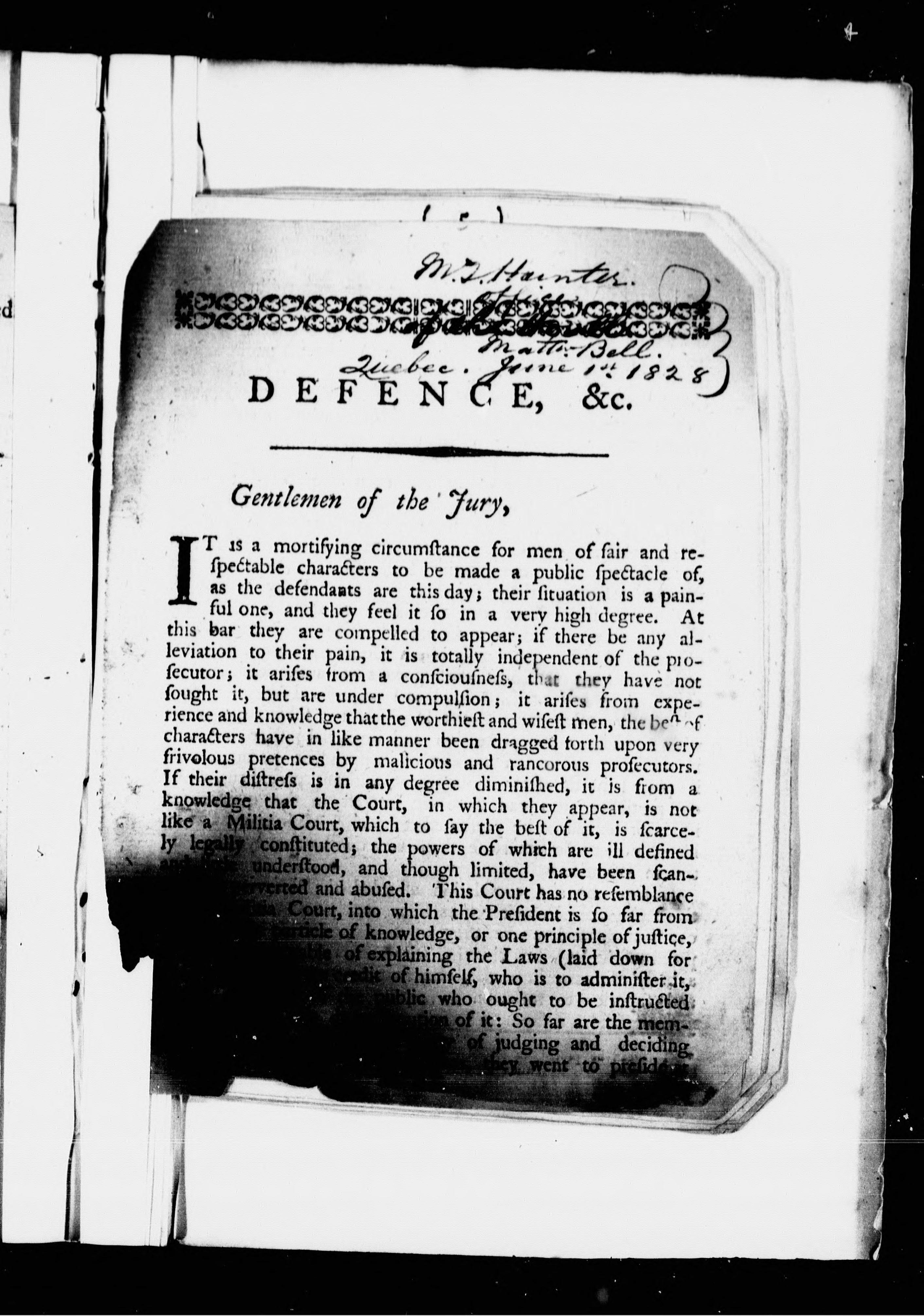 A [de]fence [prepared an]d intended to be delivered at the bar of the Court of King's Bench, held in the city of Quebec, in the month of November, 1790 :
