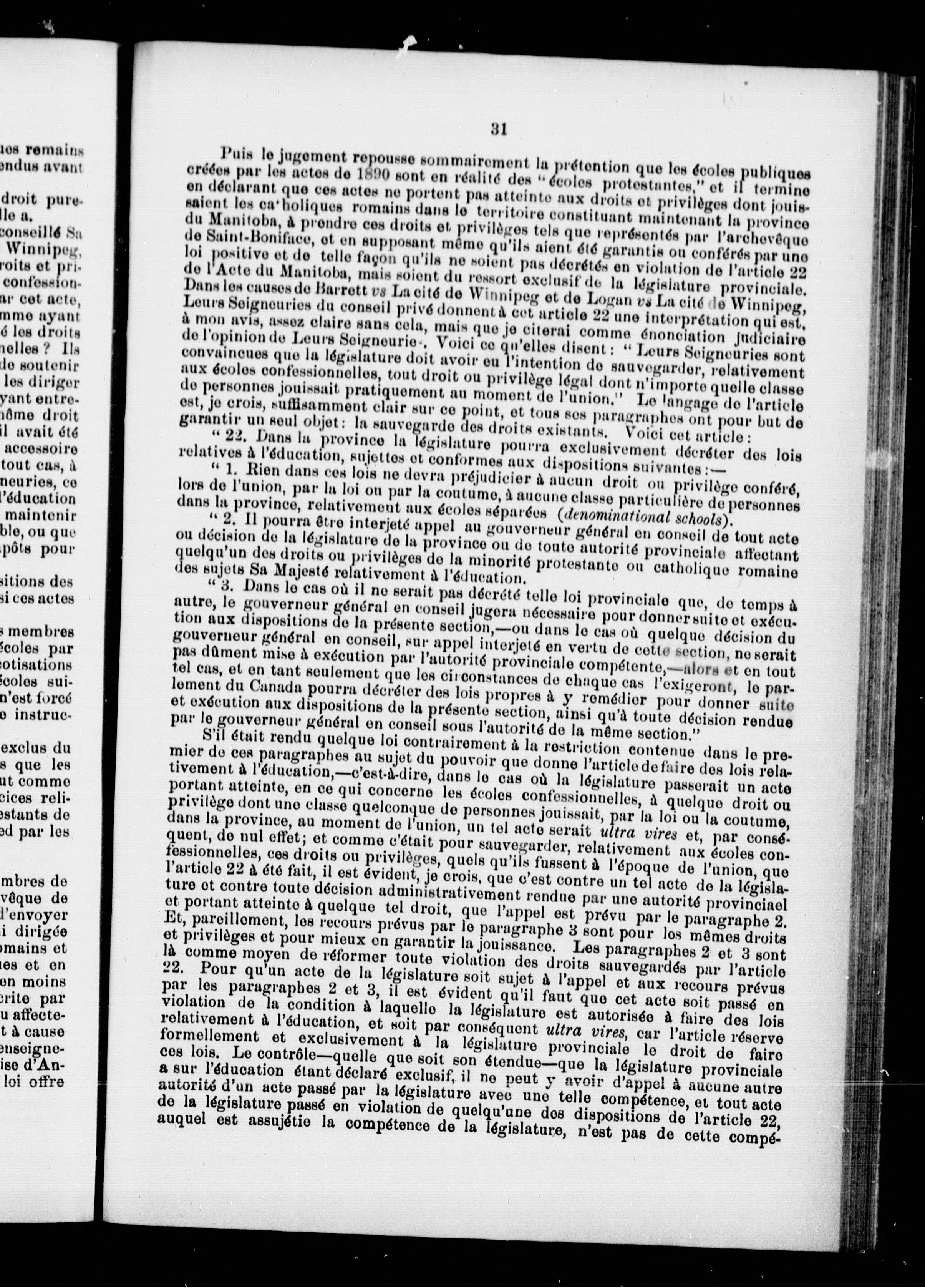 Lois scolaires et autres documents sur l'instruction publique concernant l'Assiniboia, l'Ile du Prince-Edouard, les Territoires du Nord-Ouest et le Manitoba y compris le jugement de la Cour suprême sur l'appel de la minorité du Manitoba.