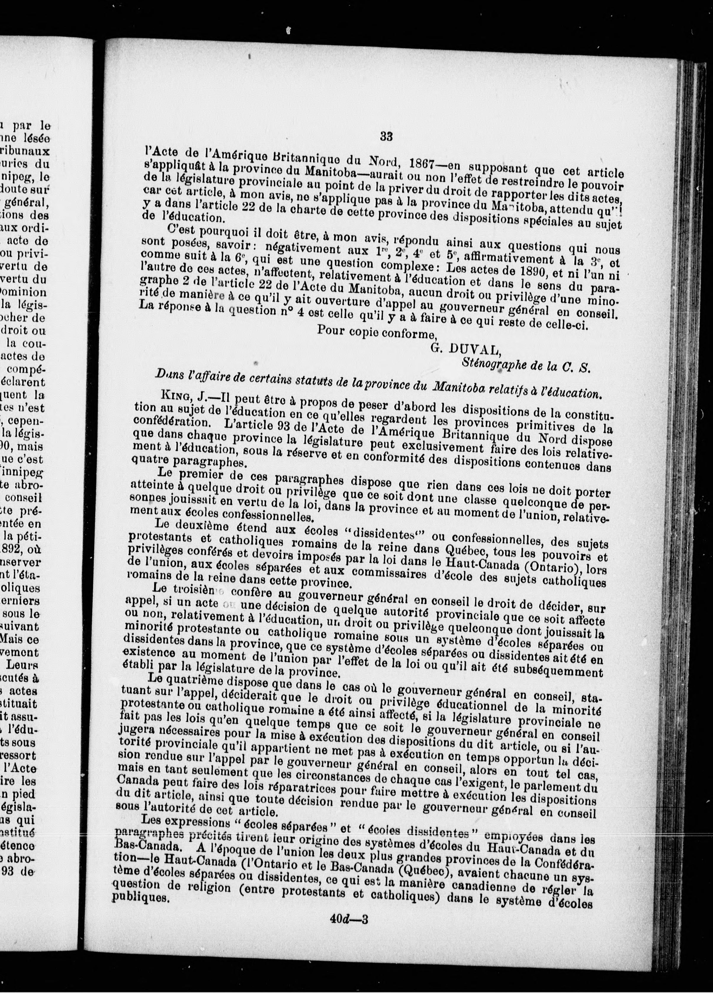 Lois scolaires et autres documents sur l'instruction publique concernant l'Assiniboia, l'Ile du Prince-Edouard, les Territoires du Nord-Ouest et le Manitoba y compris le jugement de la Cour suprême sur l'appel de la minorité du Manitoba.