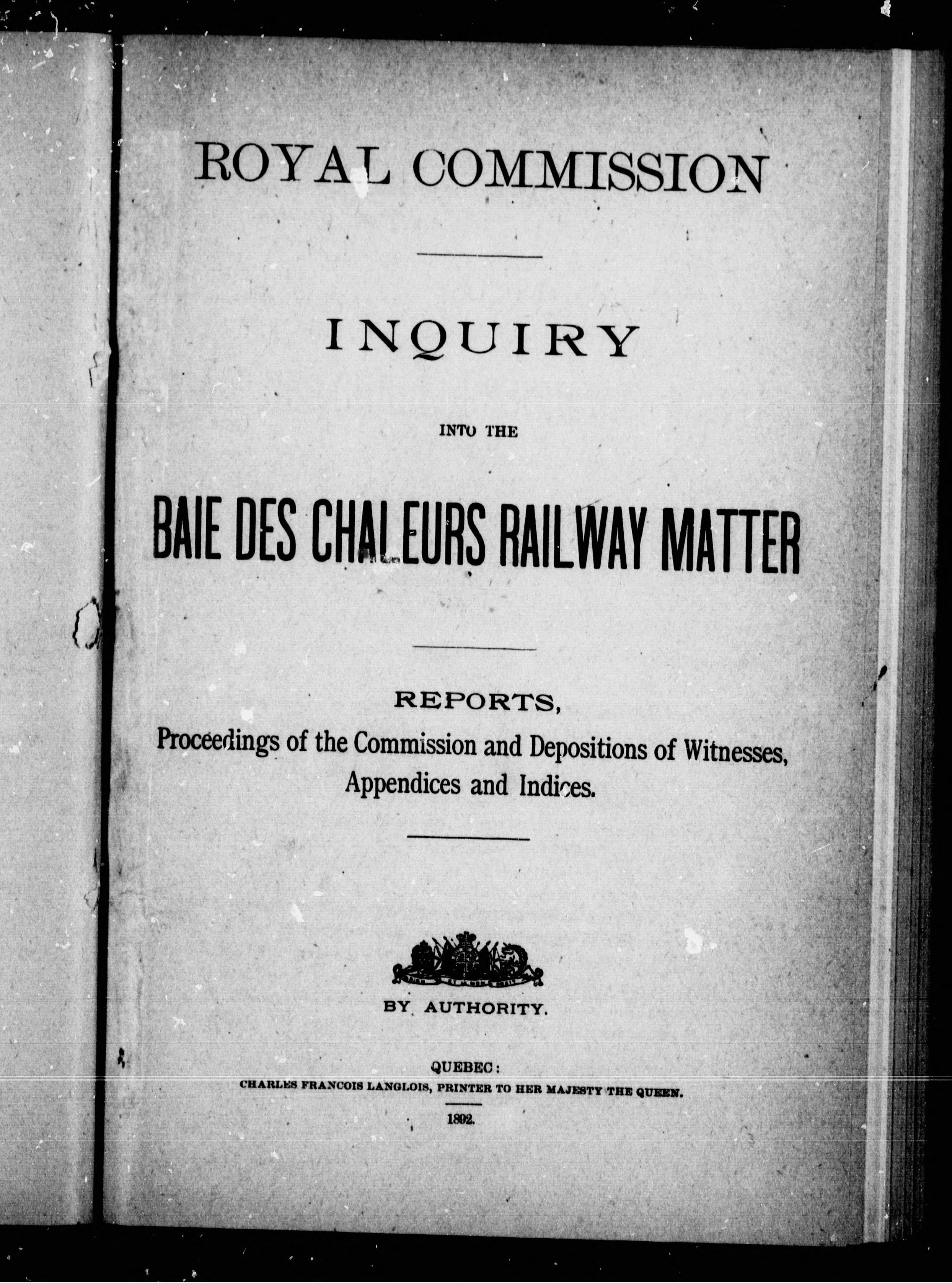Quebec (Province). Royal Commission of Inquiry into the Baie des Chaleurs Railway Matter.